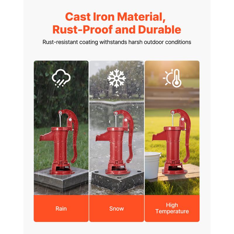 • Durable Cast Iron Build: Crafted from cast iron with rust-resistant coating, our pitcher pump is built to endure. The thickened pipe handles up to 20 lbs of hammer impact, withstanding harsh outdoor conditions like rain, snow, heat, and freezing cold