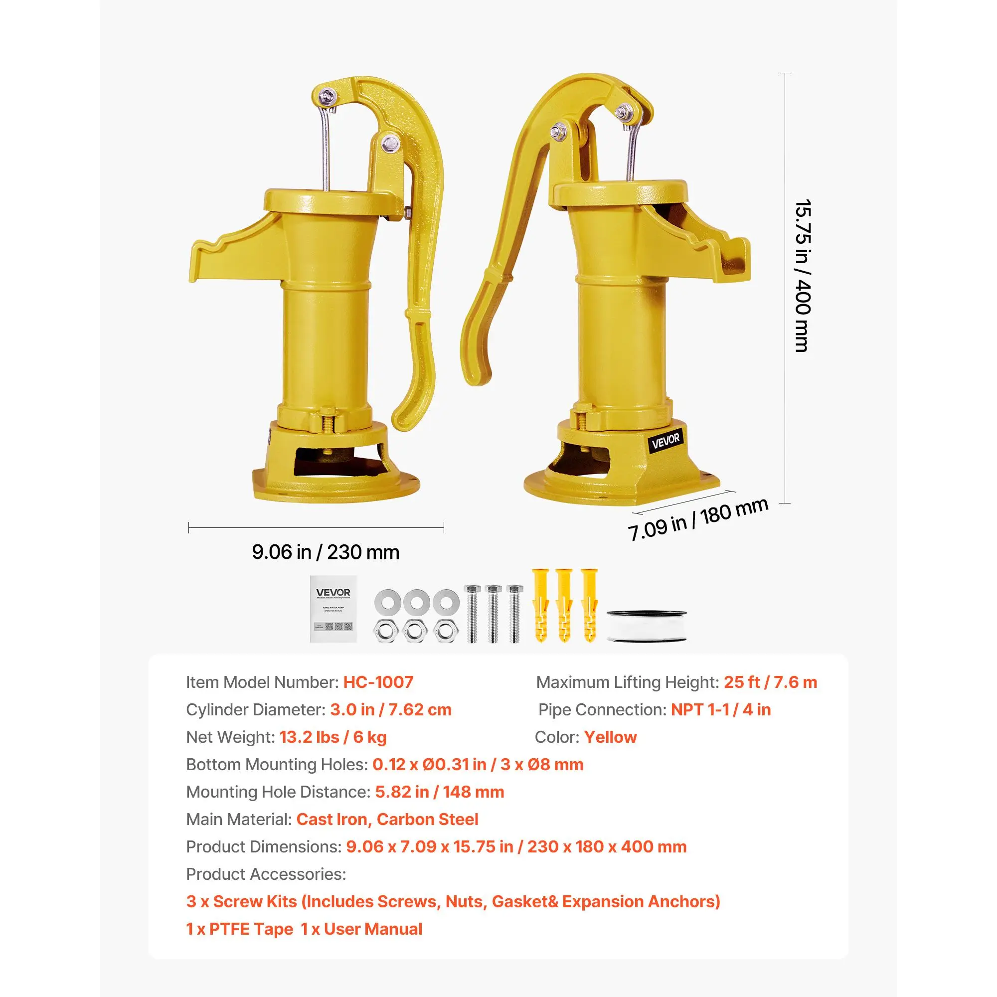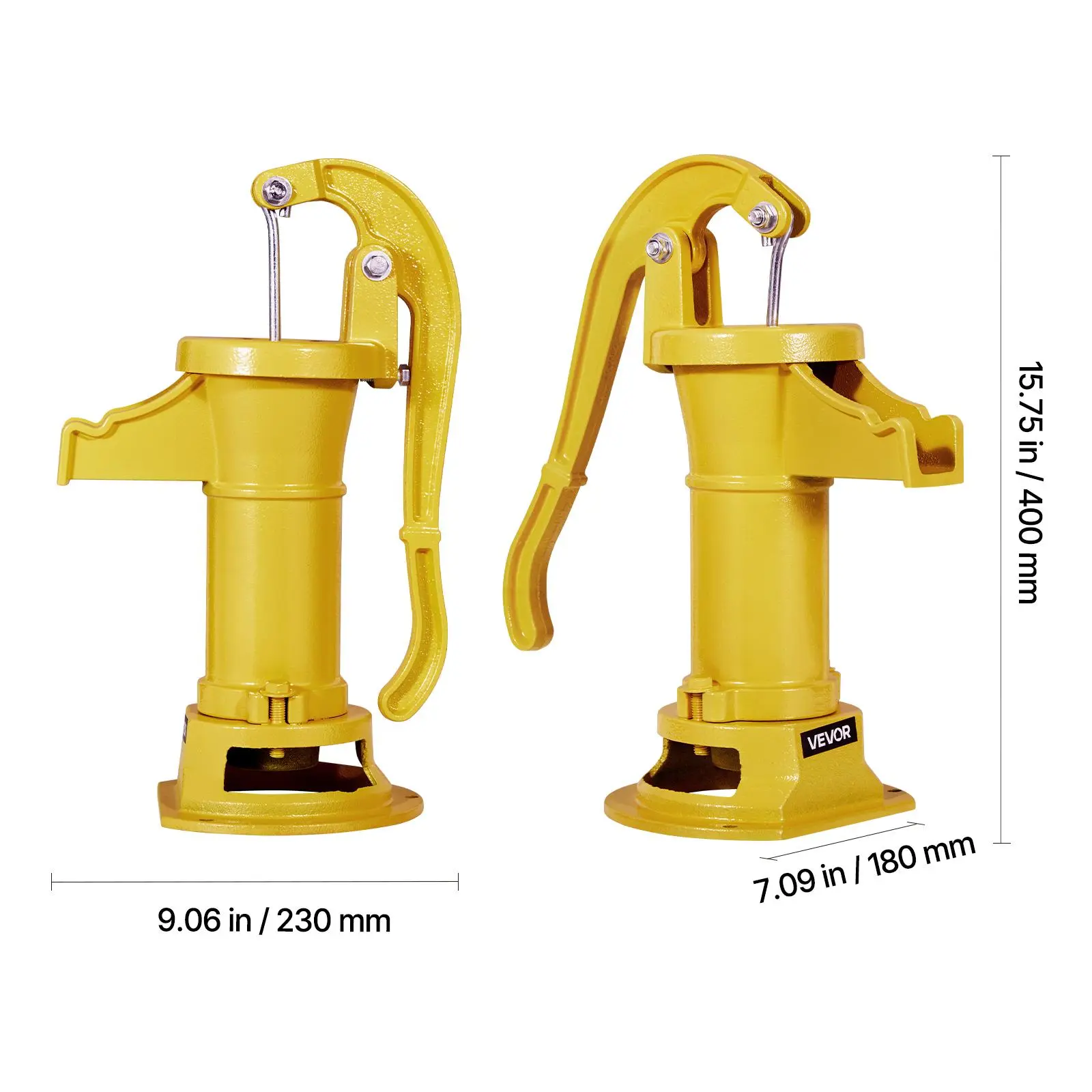 VEVOR Well Hand Pitcher Pump, 25 ft Maximum Lift, Antique Cast Iron Manual Hand Water Pump, NPT 1-1/4 in Connection, Easy Installation, Old Fashioned for Outdoor Garden, Pond, Backyard, Farm, Yellow