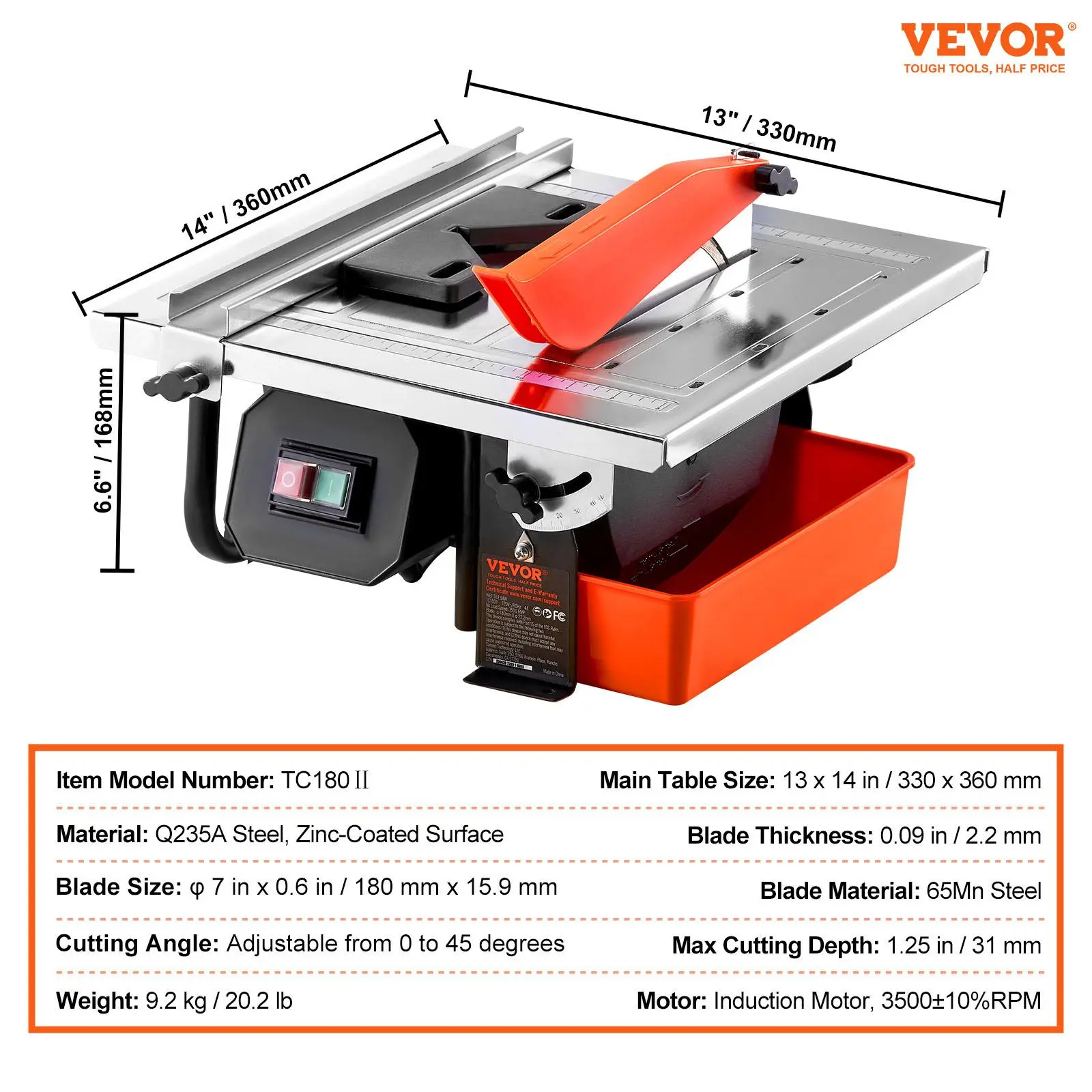 • 0-45° Angle and Deep Cutting: The VEVOR wet tile saw provides adjustable cutting angles from 0 to 45 degrees. The maximum cutting depth is 1.25 inches / 31 mm. Equipped with a thick 65Mn steel blade and a high-speed 3500 RPM induction motor, it can effortlessly cut various tiles, stones, and ceramics.