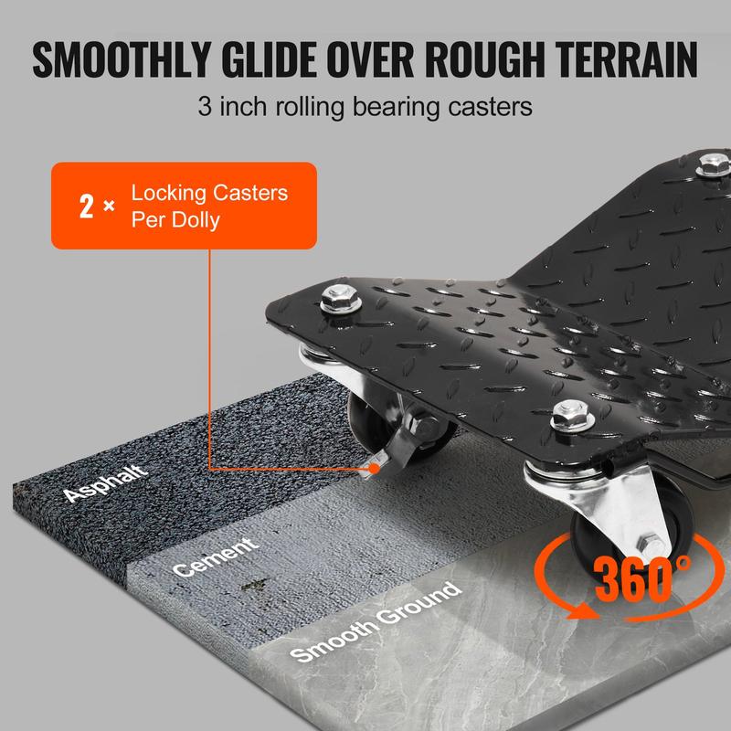 ·Easy Maneuverability: Equipped with 3-inch rolling bearing universal casters and locking casters, the cart dolly cart ensures smooth and secure movement. You have complete control over the direction and positioning of your vehicle. The foot brake lets you instantly lock the dolly, providing convenience and security during maintenance work.