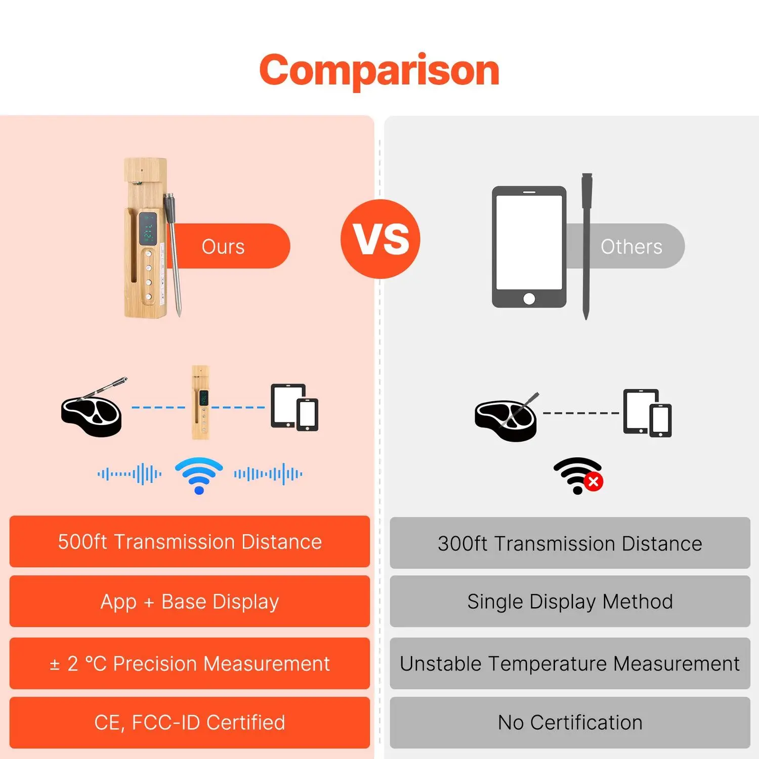 Long-Range Power: This wireless meat thermometer has Bluetooth 5.2 for long-range power, sending temperature updates to your phone from up to 500 ft away. There's no need to hover in the kitchen - let the thermometer keep you posted so you can adjust the cooking as needed!