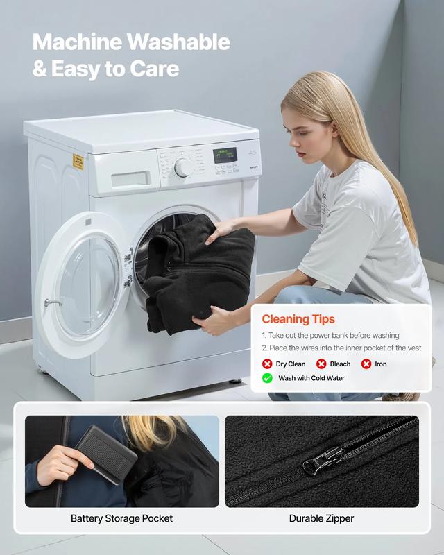 ·Easy Care: The heating vest is machine washable, making cleaning effortless. Please take out the power bank and place the vest’s wires inside the inner pocket before washing