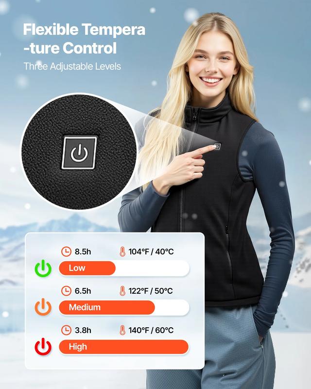 ·Three-Level Temperature Control: Our heated vest for women provides three heat settings—high 140 °F/60 °C, medium 122 °F/50 °C, and low 104 °F/40 °C. You can flexibly adjust the temperature with a simple button according to your needs