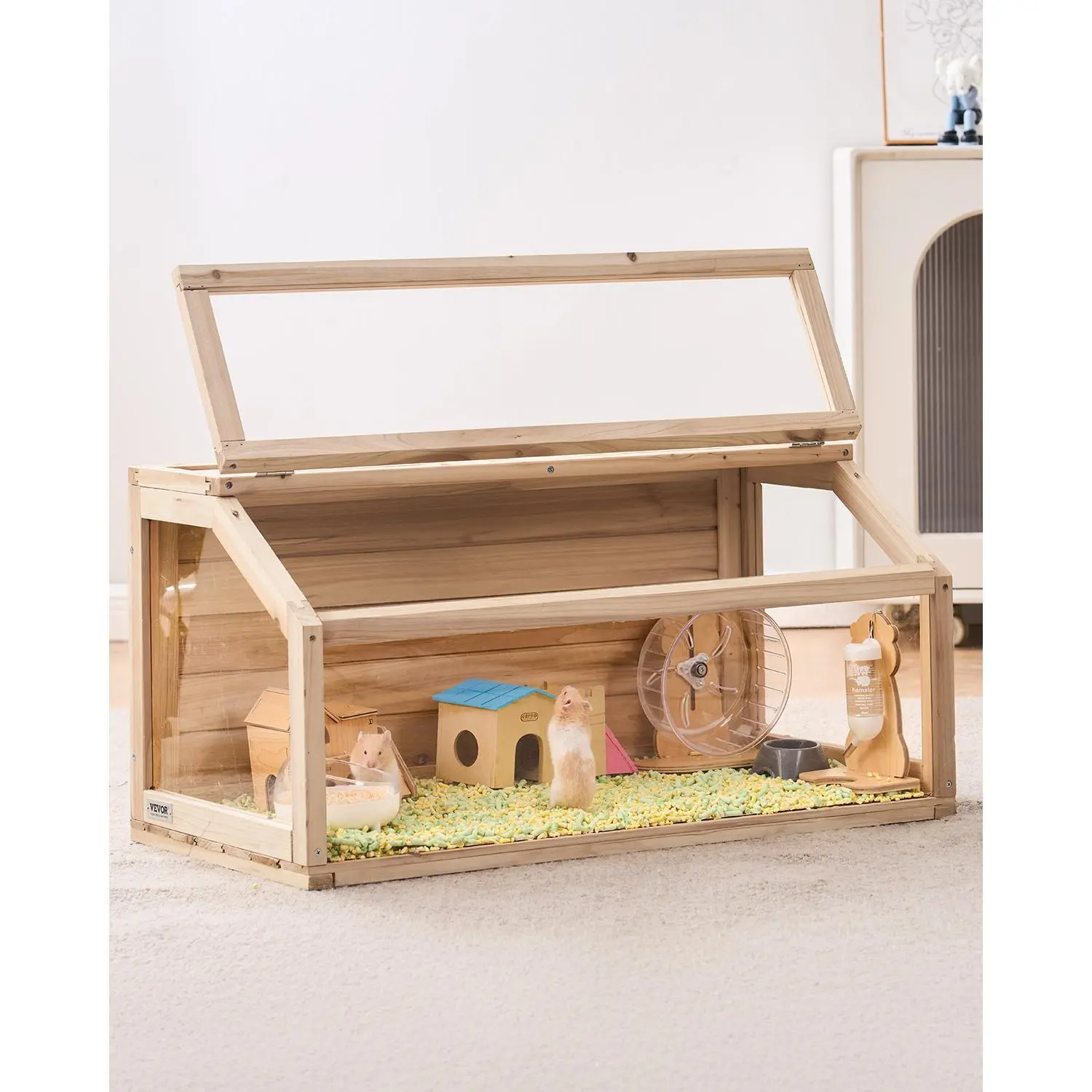 ·Visual Enjoyment: Featuring transparent acrylic panels and a large viewing window, this wooden hamster cage allows pet owners to observe their hamster’s activities at any time, adding to the joy of having a pet.