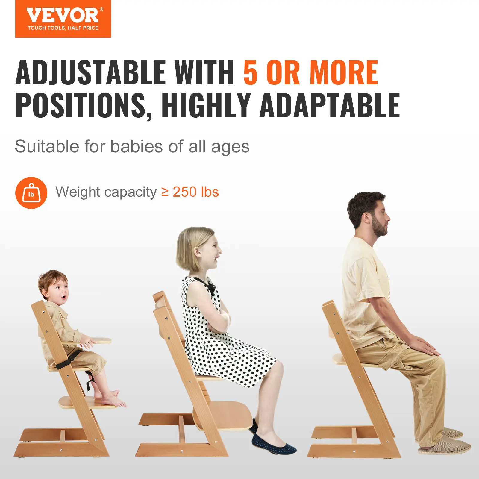 • 5-Level Versatility with Strong Adaptability: This high chair offers conversion to any height position, functioning as both a toddler chair and a traditional dining chair suitable for all age ranges. It can be tailored to fit the varying stages of your child's growth, ensuring a comfortable and secure dining experience. With a maximum weight capacity exceeding 250 pounds, this chair grows with your child from infancy through childhood.