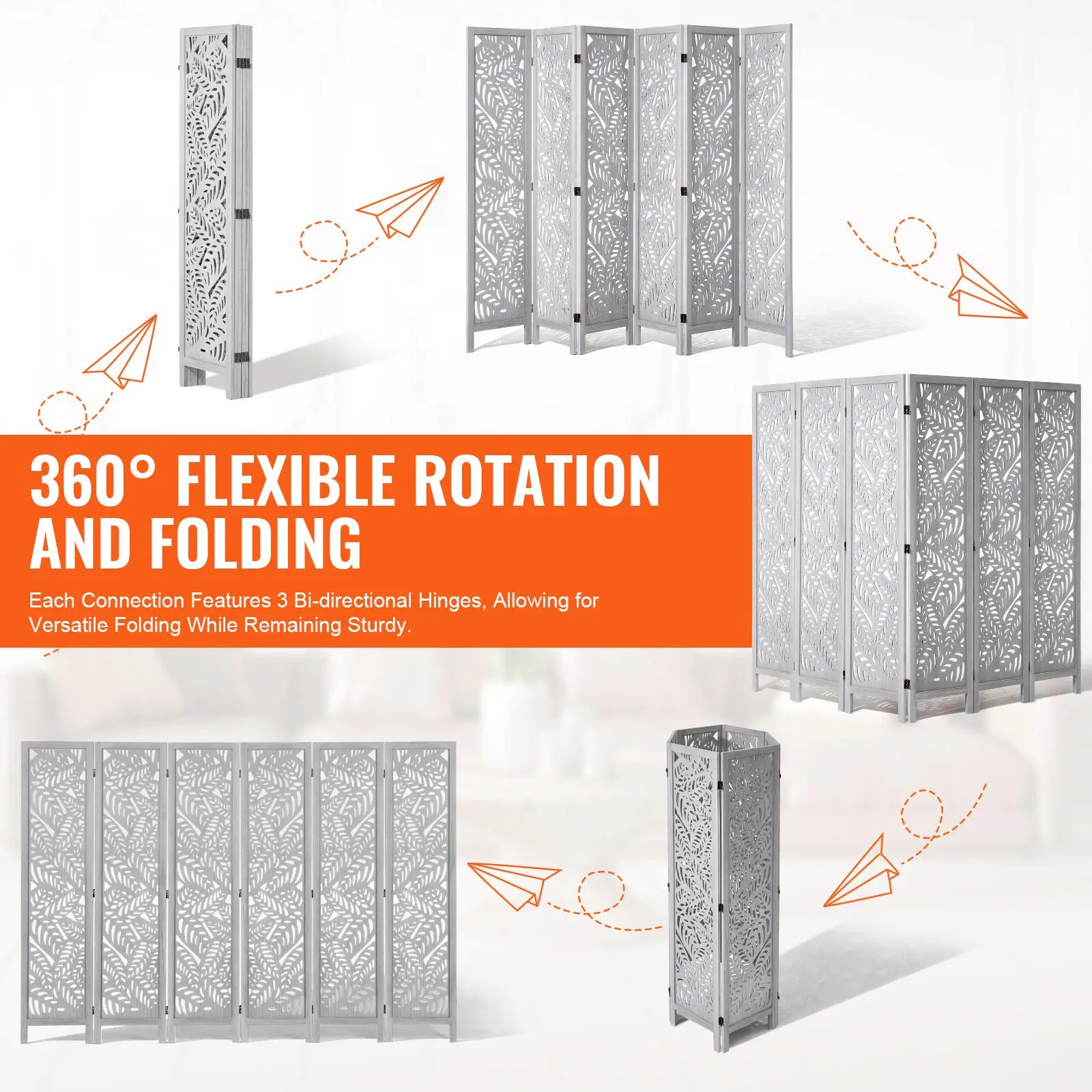 • Flexible 360° Movement: Each room divider panel connects with three sturdy double-directional hinges, allowing you to rotate and fold at any angle. When not using it, fold it and tuck it away in a corner. For added stability, arrange it in a zigzag pattern to keep it from tipping over when fully extended.