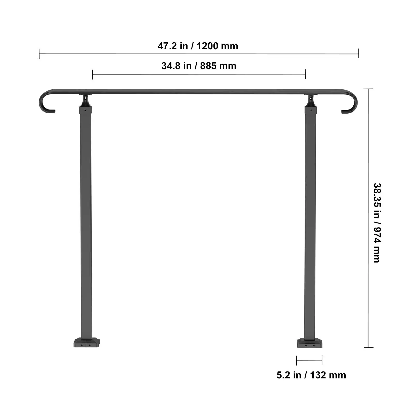 • Flexible for 2 Steps: Max Height for Steps: 23.6 in/60 cm; Distance Between Posts: 34.8 in/88.5 cm; Post Height: 38.35"/97.4 cm. Due to the flexible height, our wrought iron handrail fits your 2 steps according to the different sizes. It is perfect for helping people keep balance in the rain or winter and prevent skidding.