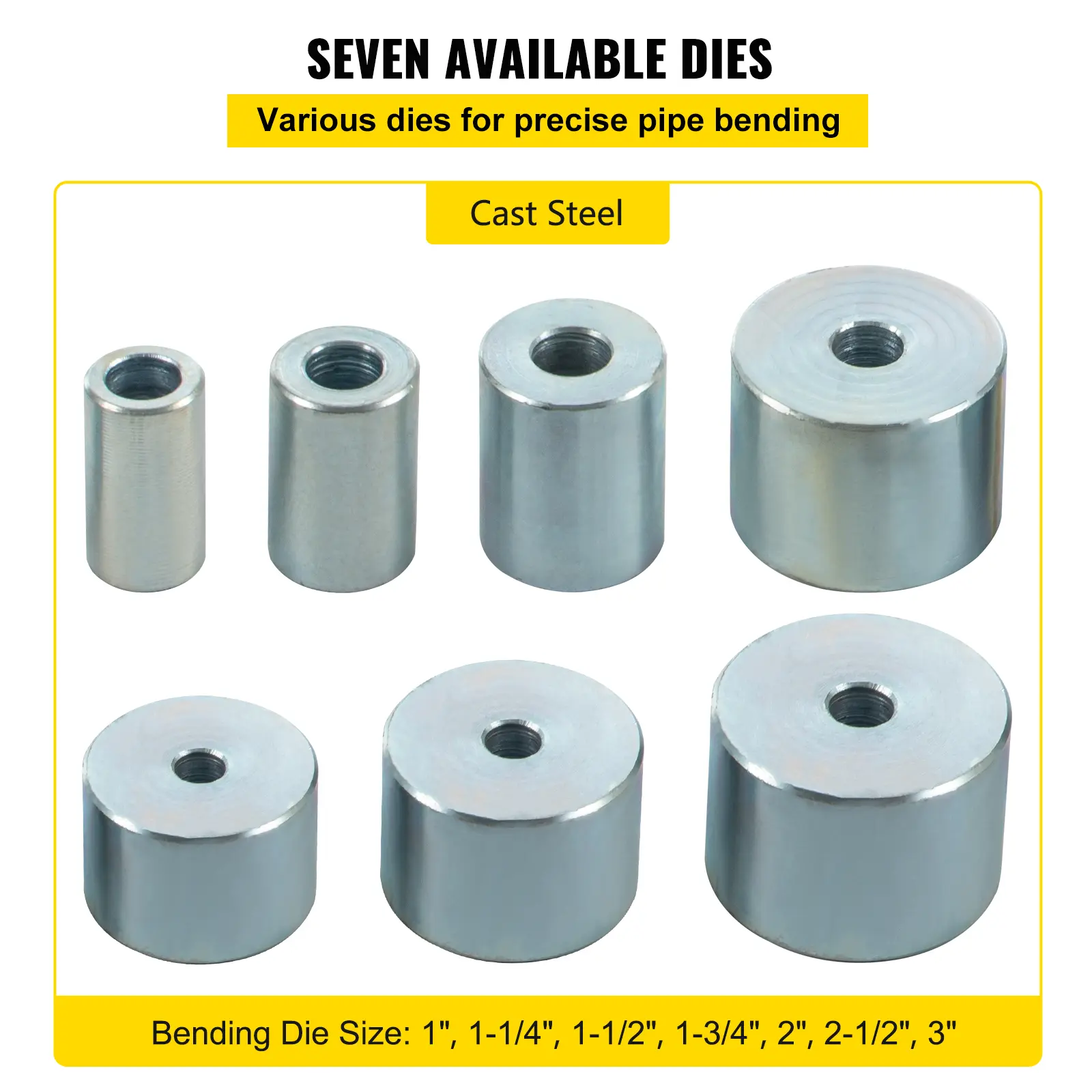 • 7 Superior Steel Dies: We provide 7 interchangeable tube bender dies, ranging from 1" to 3". All these are made of reinforced steel for durable use. The bending heads can meet different usage needs, making your work more convenient.