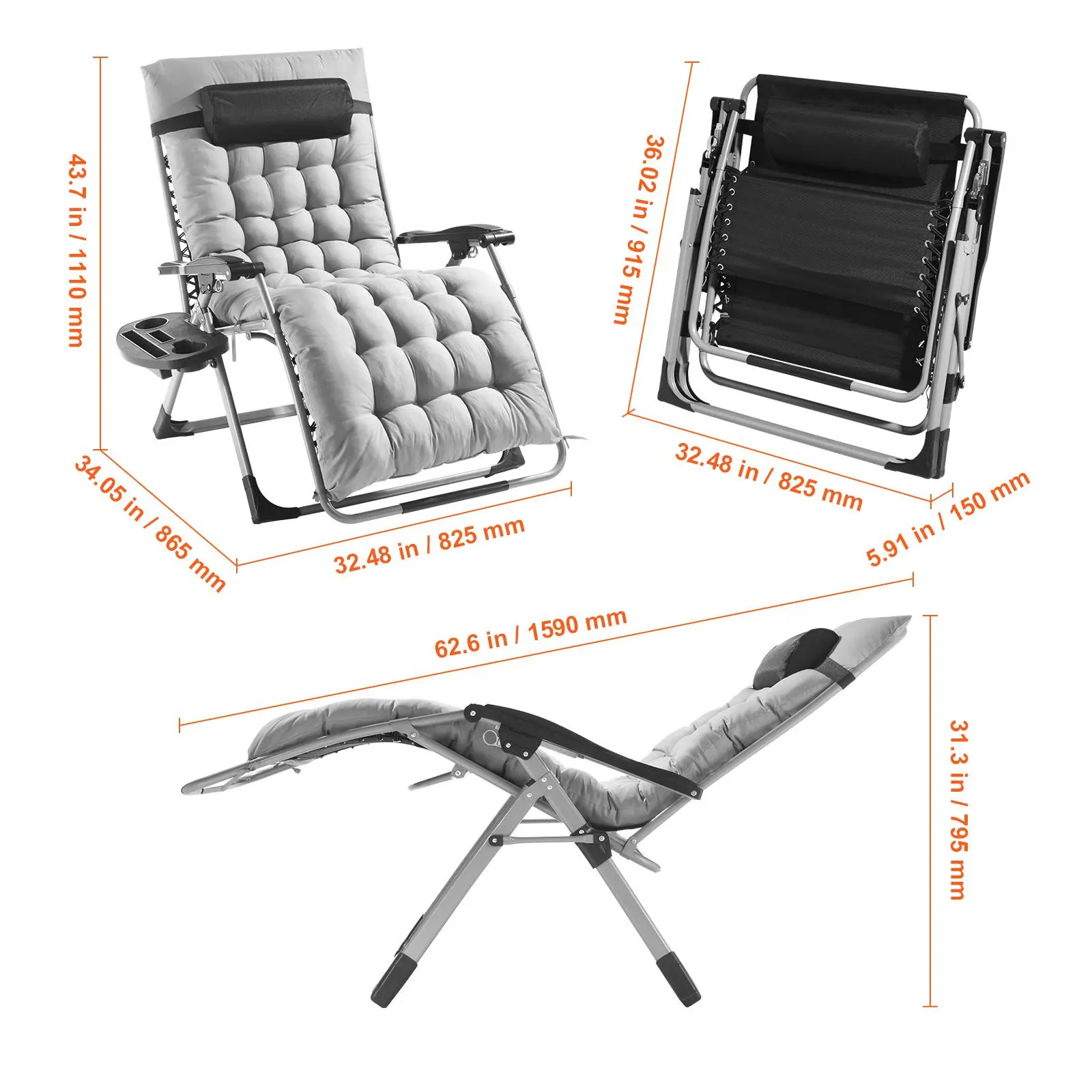 • 500lbs Heavy-Duty Support: Featuring a robust triangular frame, reinforced square steel tubes, 8mm aluminum locks, and double-layer elastic cords, this 33" zero gravity chair offers exceptional stability and supports up to 500lbs. Ideal for users of all sizes.