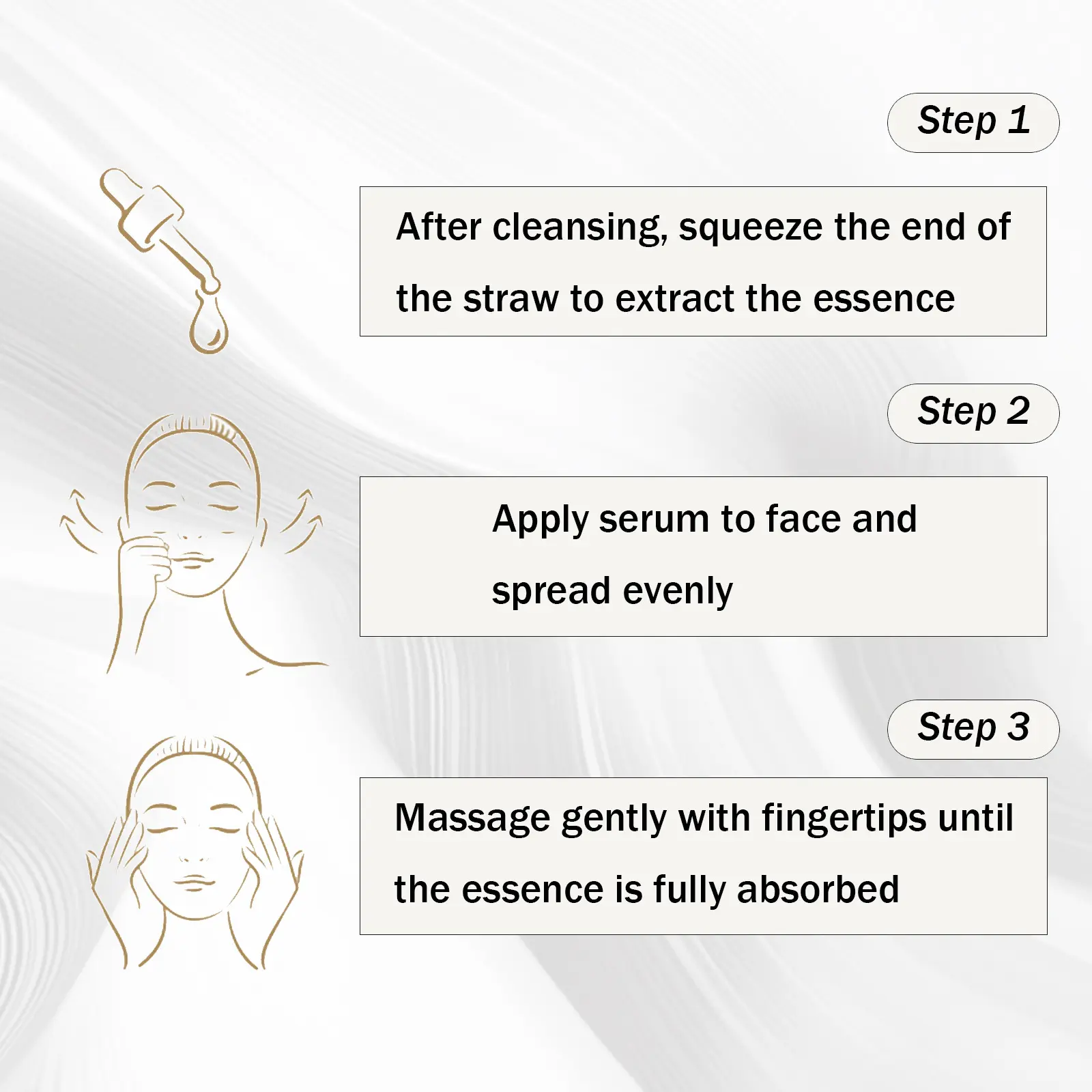 After cleansing and toning the skin, apply 2-3 drops onto the skin and gently press until absorbed.