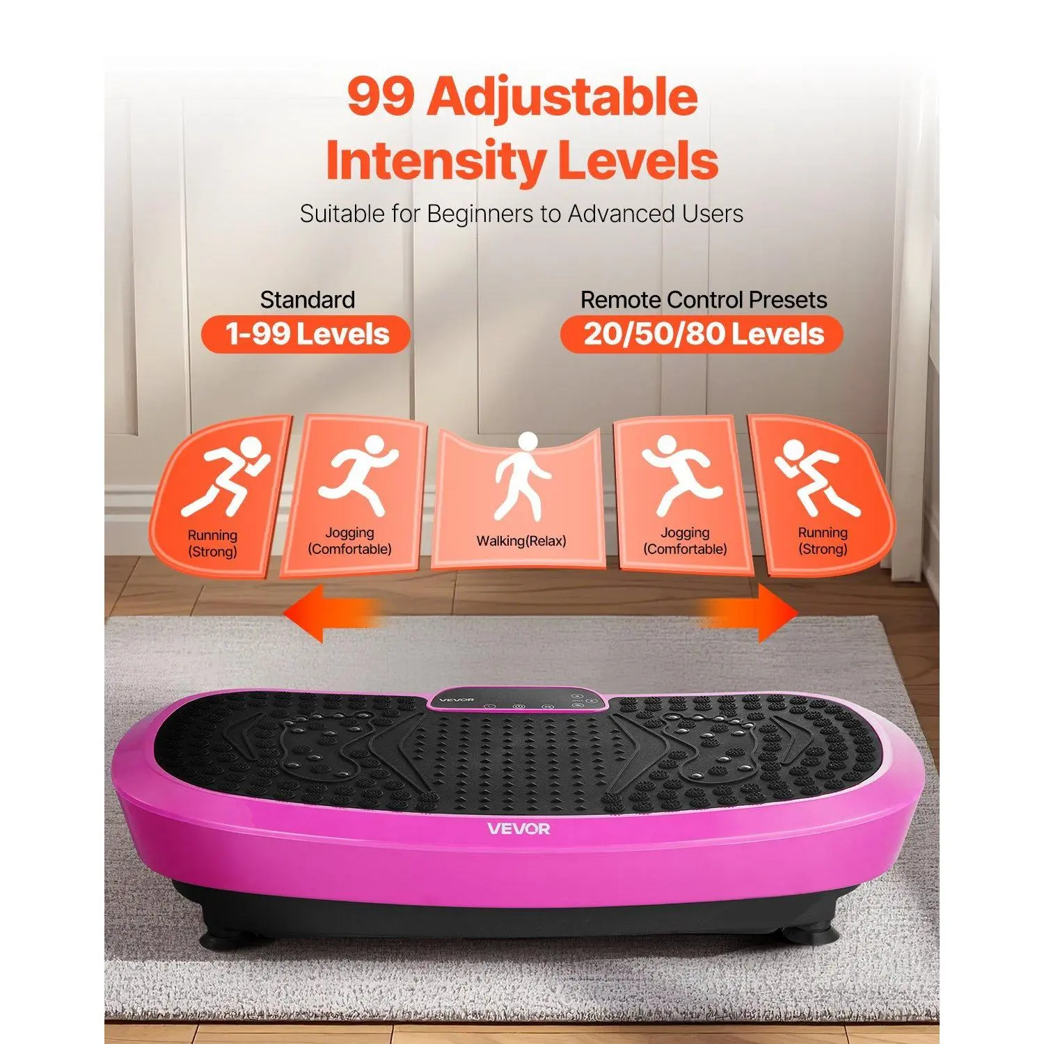The vibrating plate has 99 adjustable modes for all fitness levels, including a "strong running - comfortable jogging - relax walking" cycle.Whether you're a beginner or an advanced user, you can choose from 1-99 settings or quickly switch to preset modes of 20/50/80 via the remote control.