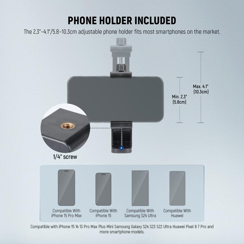 ·Phone Holder & Action Cam Adapter Accessories- The 2.3"~4.1"/5.8~10.3cm widened phone holder is compatible with iPhone 16 15 14 13 Pro Max Plus Samsung Galaxy S24 S23 S22 Ultra Huawei Google Pixel 9 8 7 Pro and more smartphone models. The action camera mount adapter is compatible with GoPro Hero 13 12 11 10 9 8 7 Black go pro max DJI OSMO Action 5 pro 4 3 2 Insta360 x4 X3 X2 insta 360 Ace Pro, etc. Tall tripod stand For selfies, photography, vlogging, video recording, live streaming, etc.