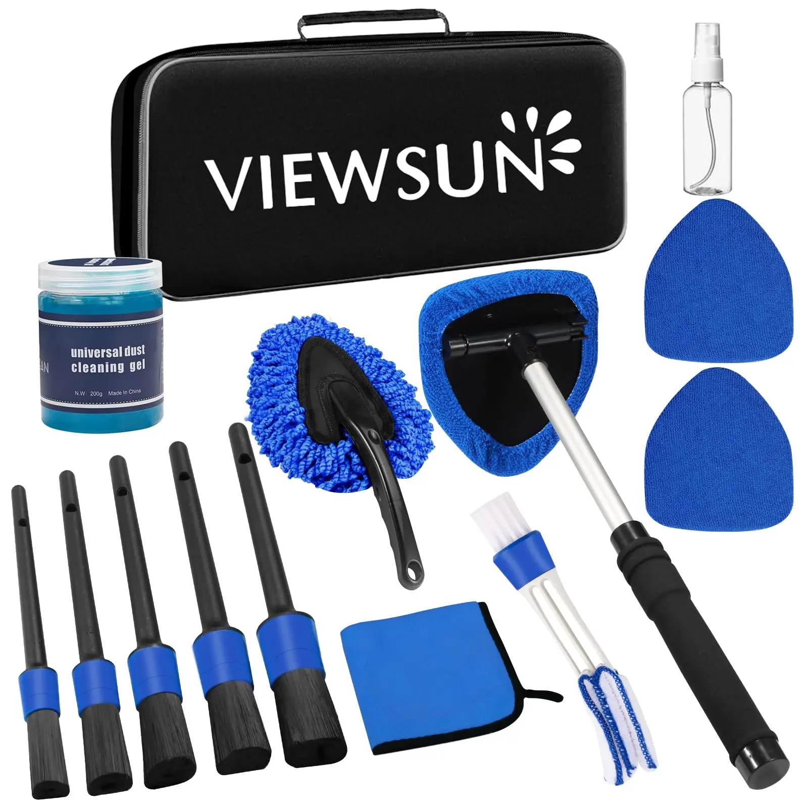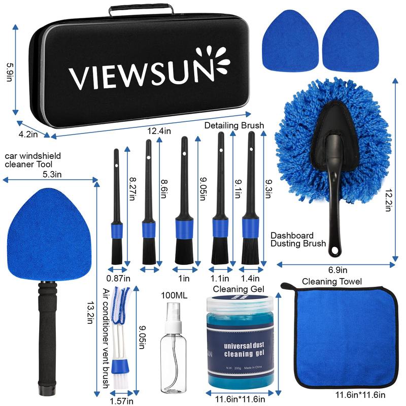 ·All-in-One Car Interior Cleaning Solution: Viewsun Car Interior Detailing Kit includes 14 essential tools: car windshield cleaner*1, replaceable microfiber pads*2, 100ml spray bottle*1, car detailing brushes*5, car dash duster brush*1, air vent brush*1, car cleaning gel*1, microfiber towels*1, durable storage bag*1. The car cleaning supplies contains about everything you could need to do a good cleaning on any of your vehicles at home