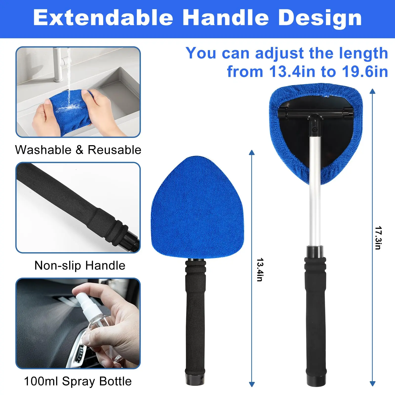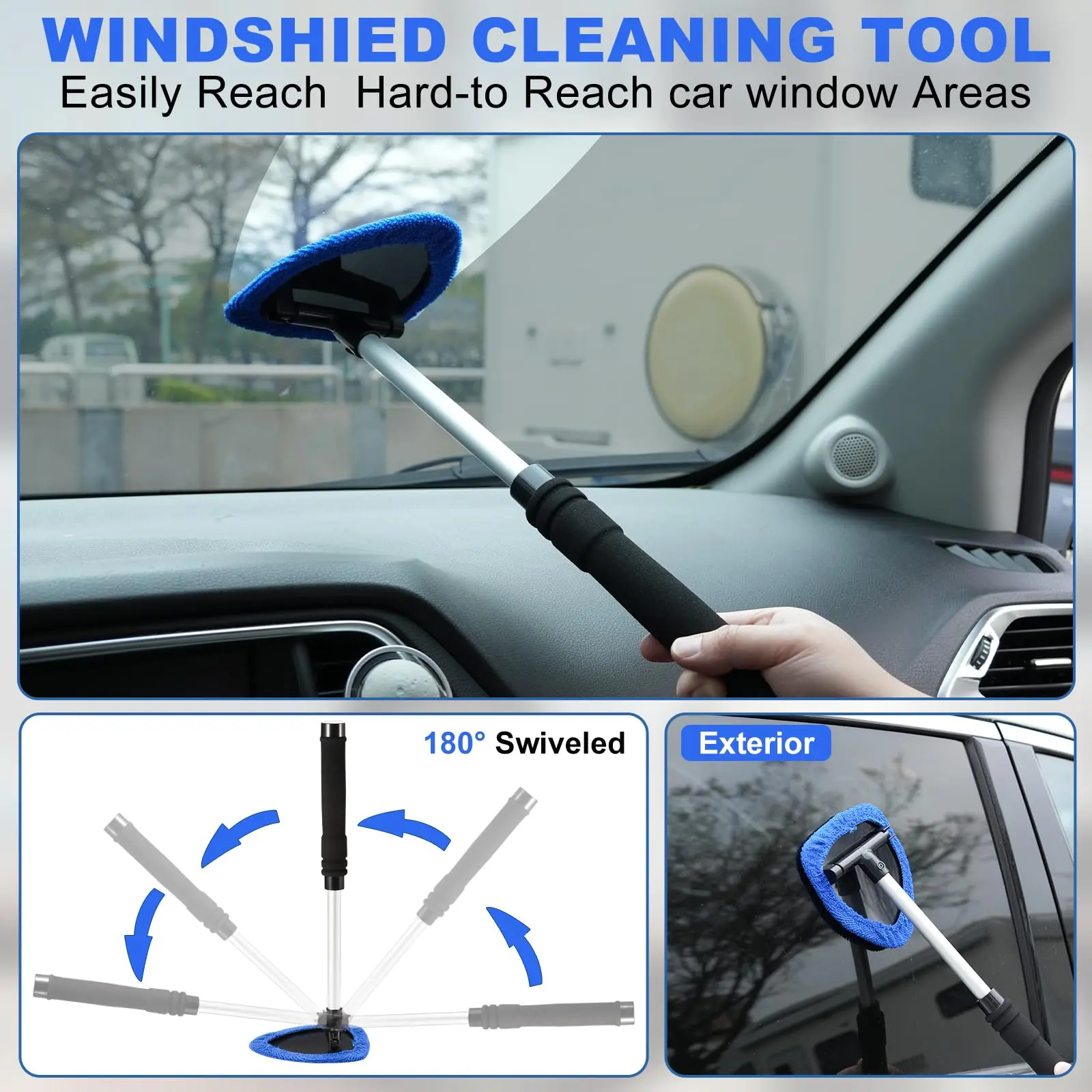·Windshield Cleaner: The Windshield Cleaner features an extendable handle with a 180°swivel head. The design allows the tool to fully conform to the glass surface and easily remove dust and dirt from hard-to-reach areas. Comes with 2 washable microfiber pads for streak-free glass cleaning. Cost-effective design ensures long-term use on automotive windows/mirrors