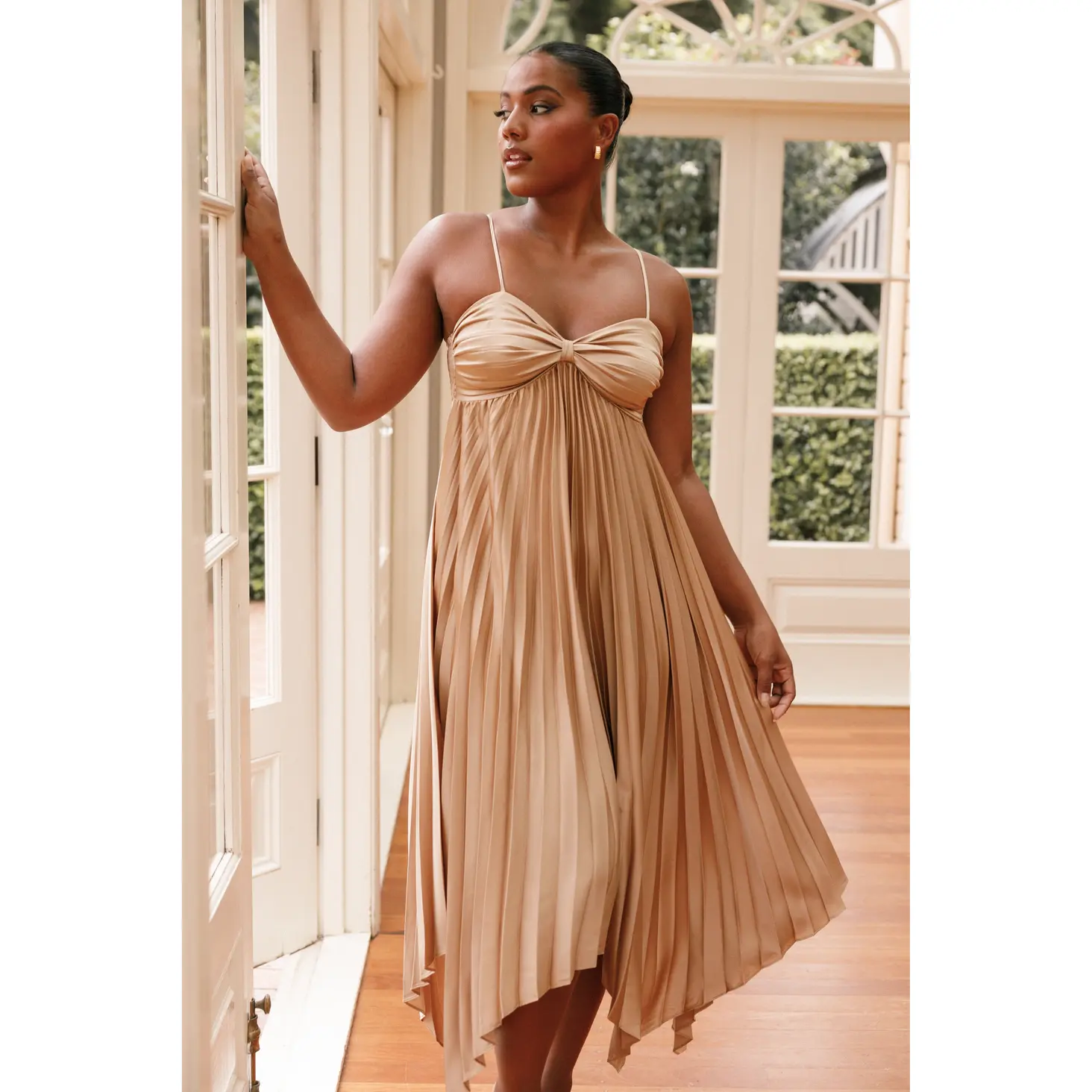 The Vikki Dress flatters any figure with its midi length, sweetheart neckline and asymmetrical hemline. Thin adjustable straps ensure the dress fits perfectly and is sure to turn heads. If you are in between sizes, we suggest selecting the size down due to the relaxed fit of this dress.