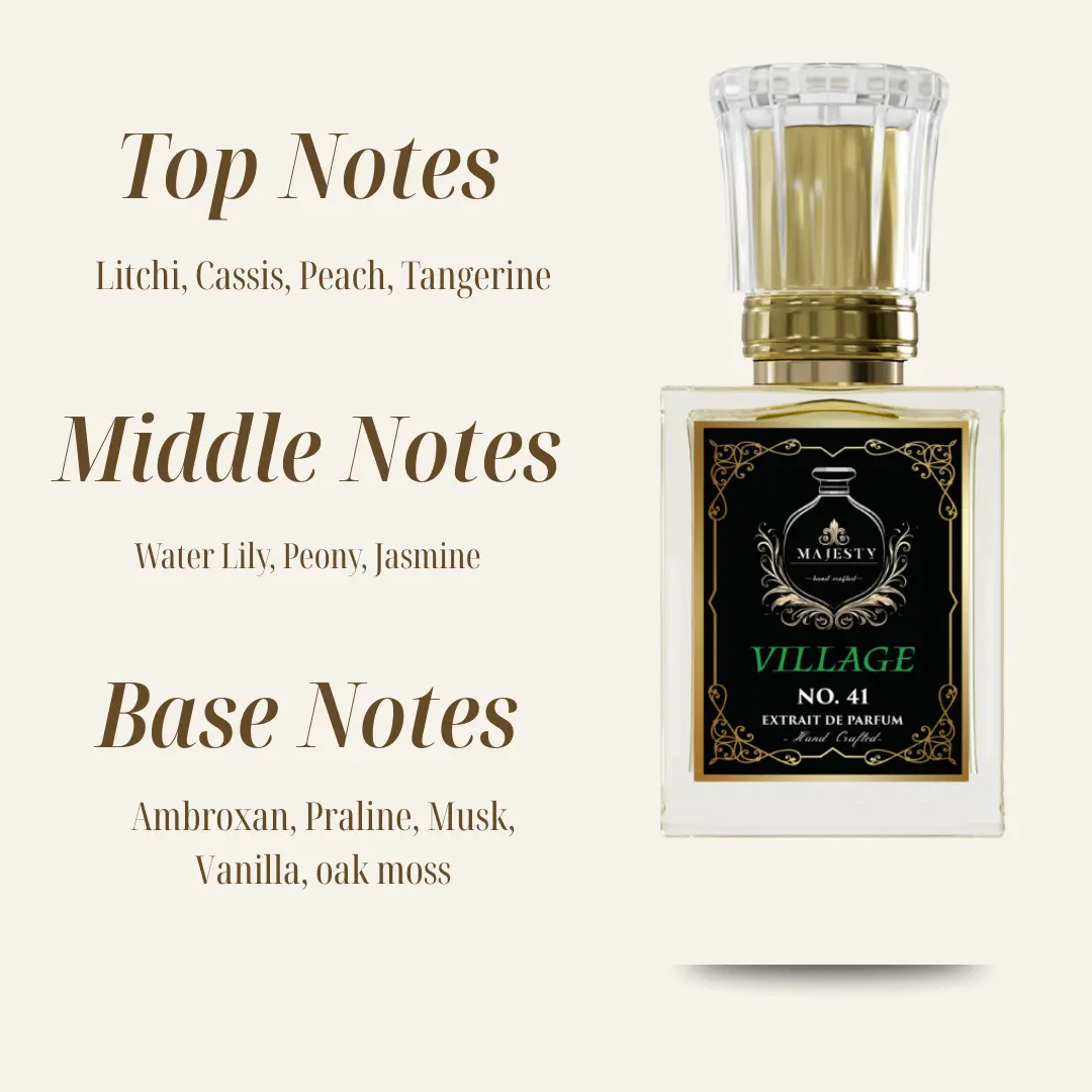 Village is a beautifully balanced fragrance blending fruity brightness, soft florals, sweet gourmand notes, and warm musk. It’s inviting, versatile, and leaves a lasting, elegant impression—perfect for any occasion.