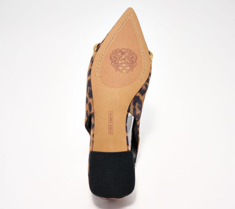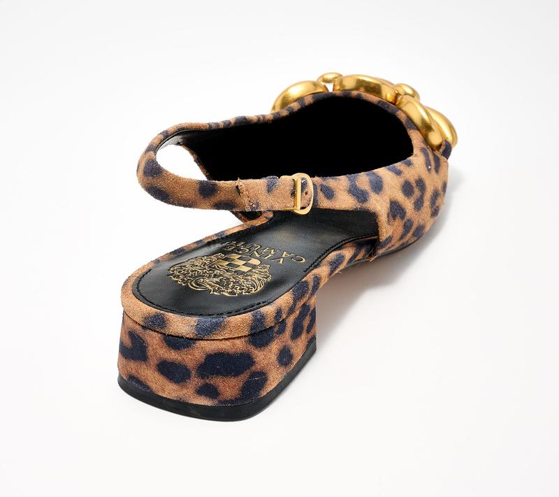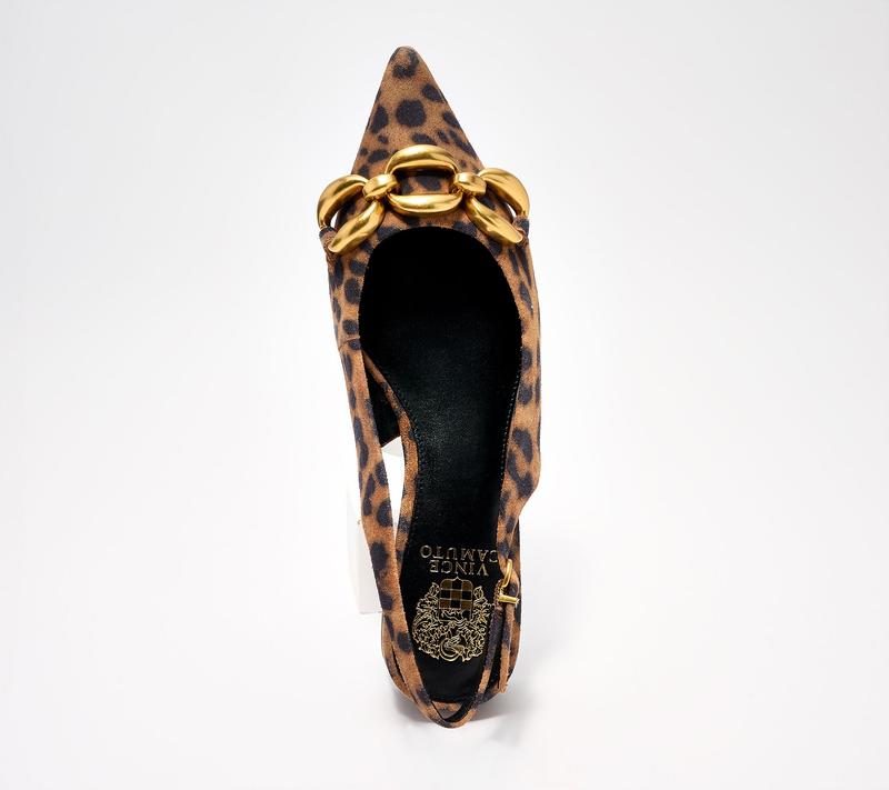 Vince Camuto Valiey low heeled slingback brings sophistication with added style. Offered in suede and leather, the pointed toe and 1" wrapped heel have an injected insole and rubber outsole with an adjustable buckle closure. The oversized chain detail on the upper elevates any outfit whether it's for business meetings or weekend fun. Pair these with bootcut jeans, blazer and cool tee. Fit: True to size. COO: Imported.