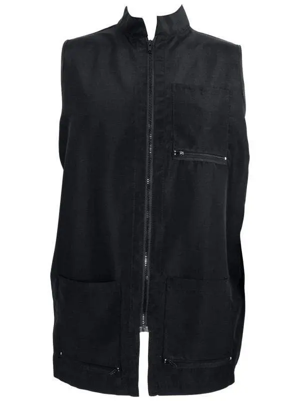 Unique collar. Sleeveless vest for mobility and comfort. Strong front zipper. Three front pockets with zippers for debris removal. Water repellent.