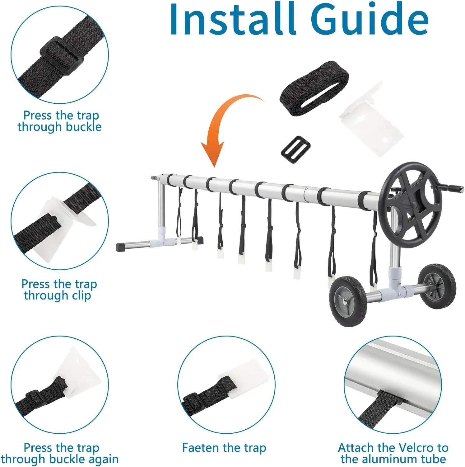 ·Wheel Barrow-Style Maneuverability - Unique design allows easy transport of the pool cover; one hand crank ensures smooth rolling and unrolling; two wheels enhance portability; features a mechanical lock to secure the roller; includes additional clips as a bonus