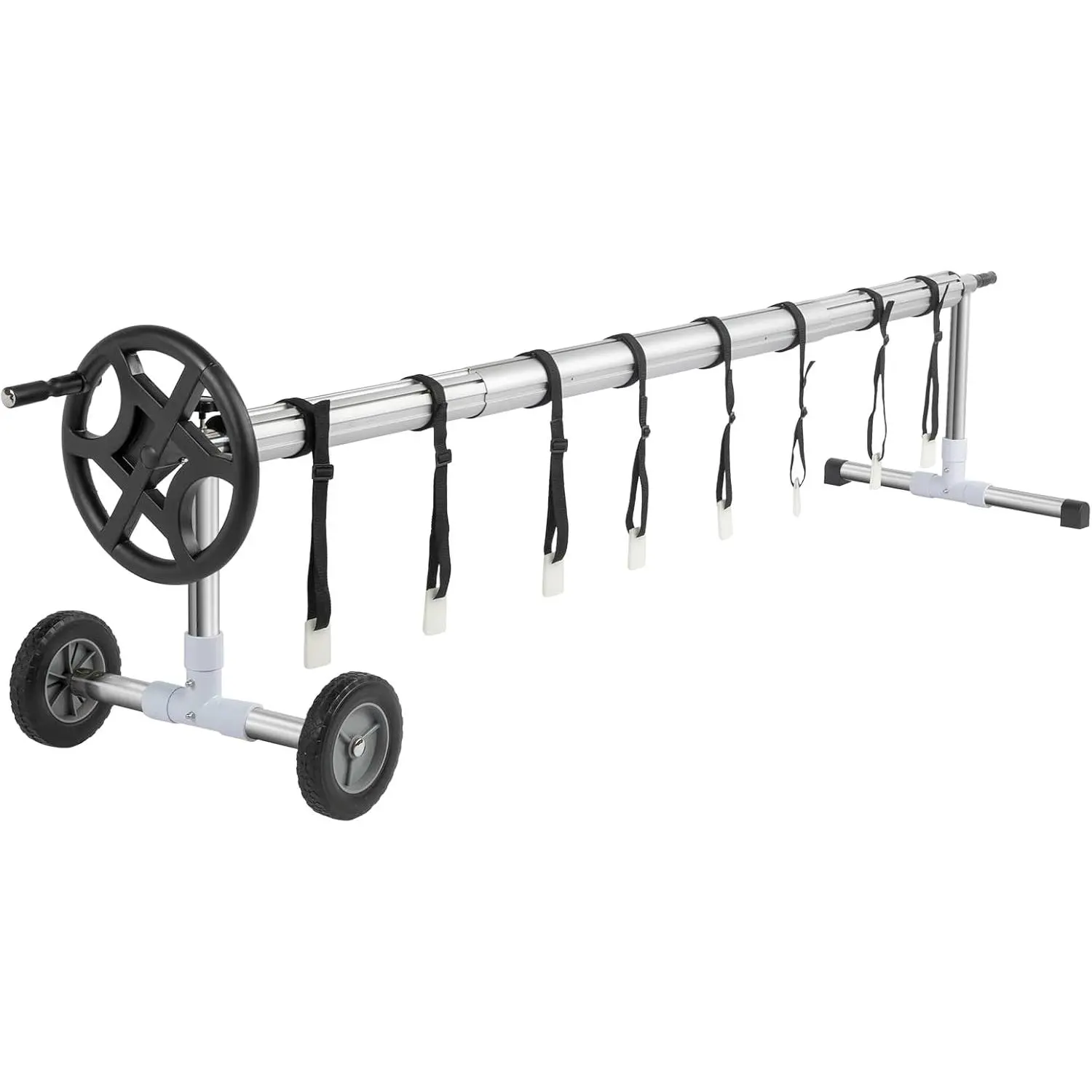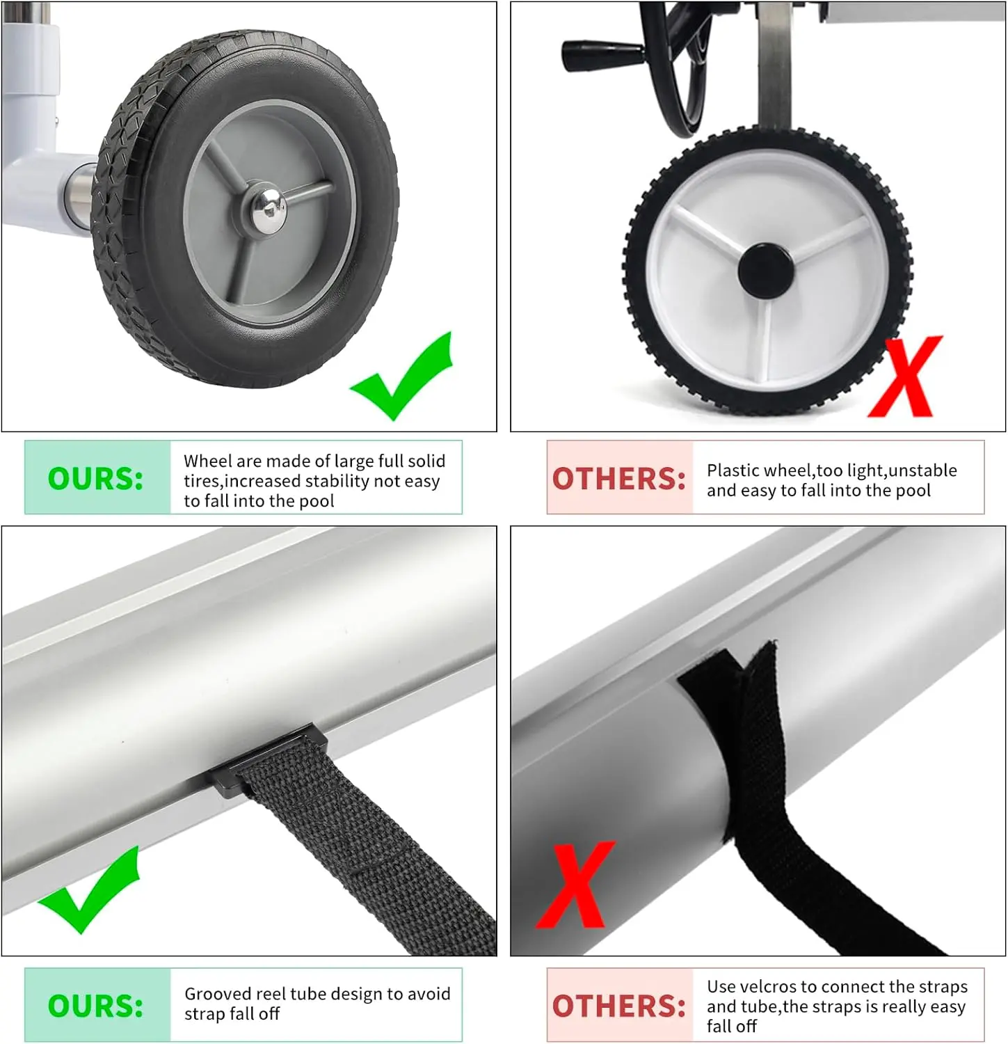 ·Durable, Maintenance-free,Rust Resistence Construction. Excellent value when compared to other reels. 5-section Φ3.19‘’/Φ2.99‘’ aluminum pipe design , not easily droop. Grooved reel tube design to avoid strap fall off. It's thick and relatively solid, the reel is aluminum, so nothing can rust, wheels are made of large full solid tires, so this reel will durable