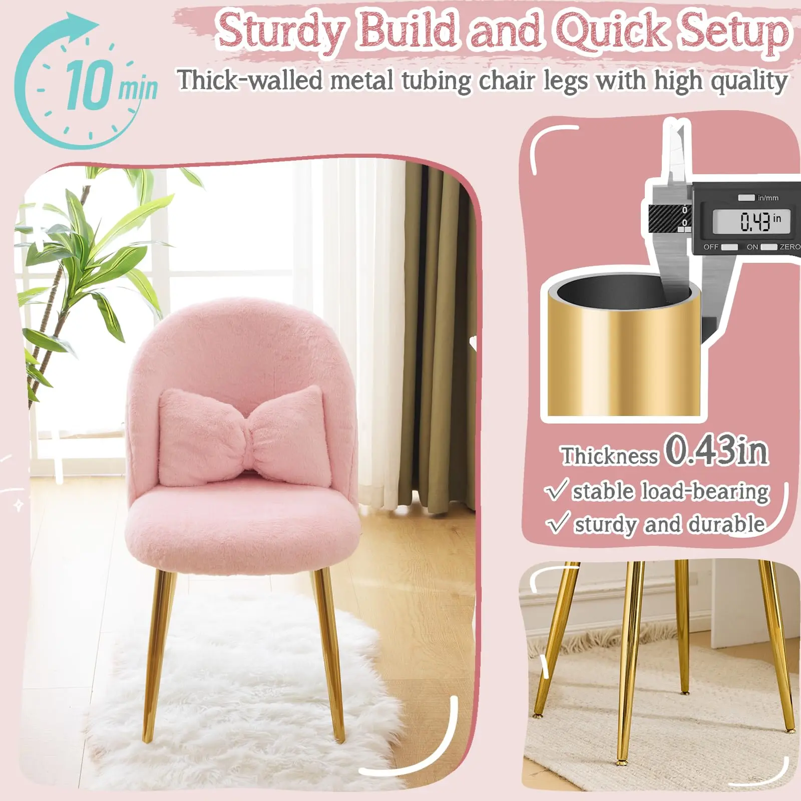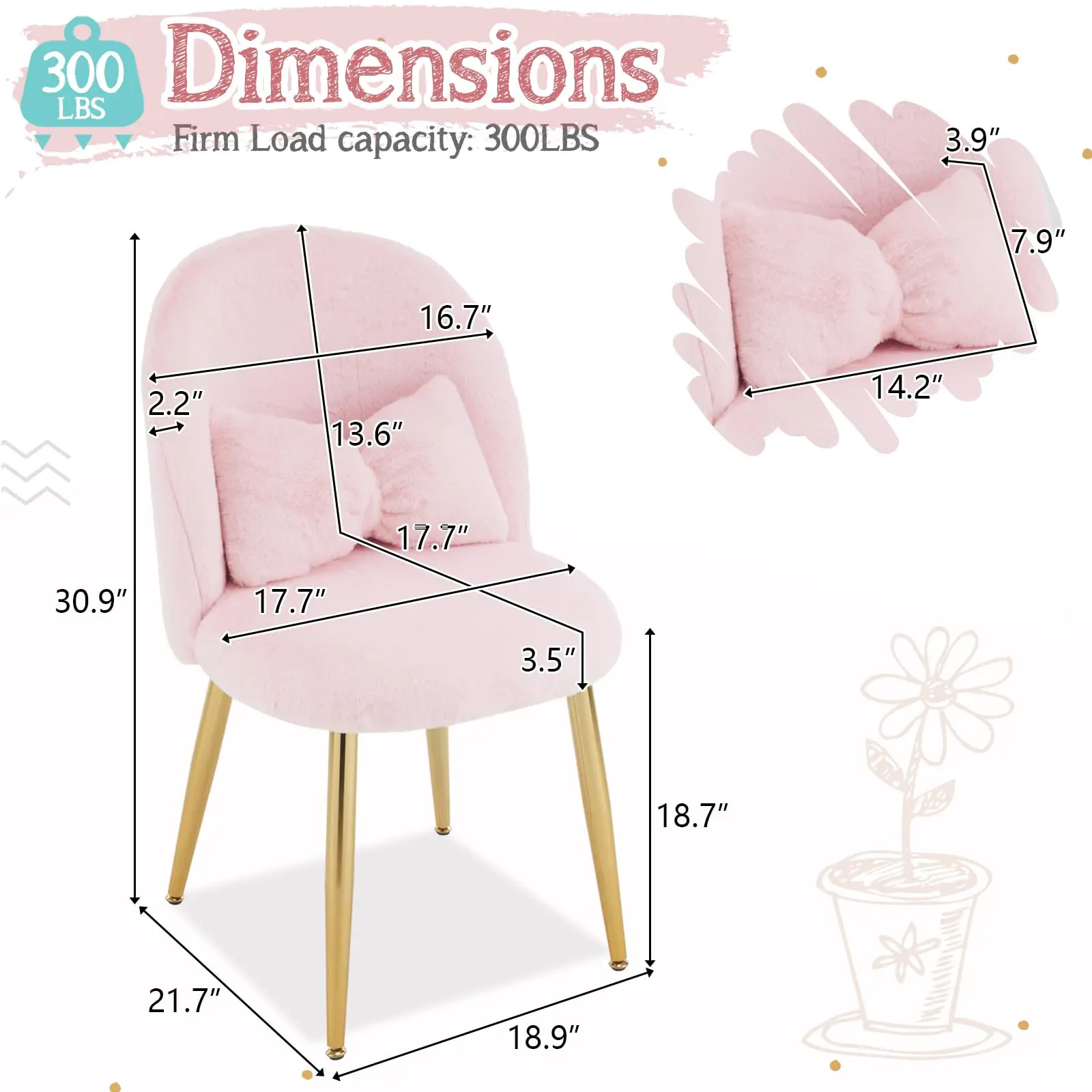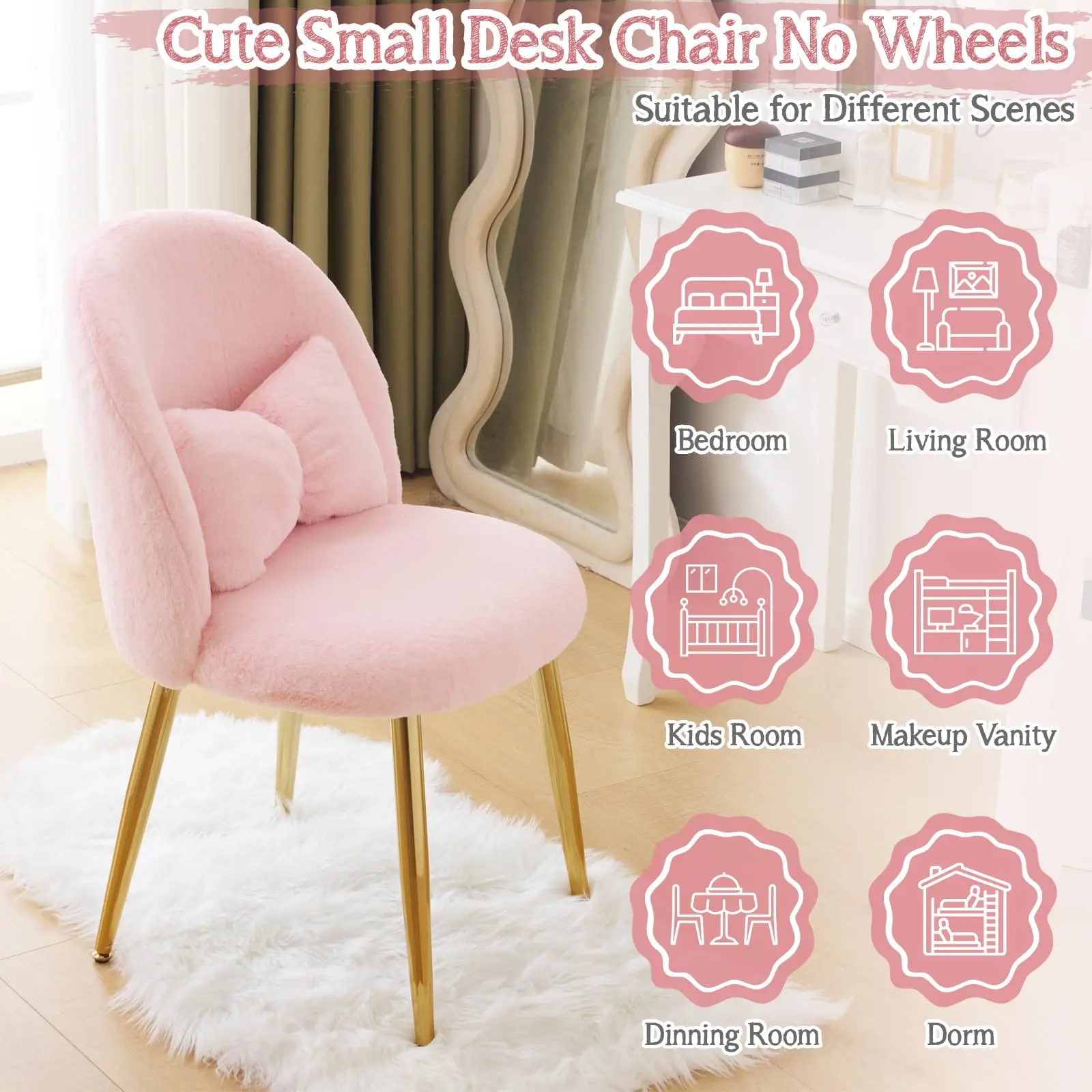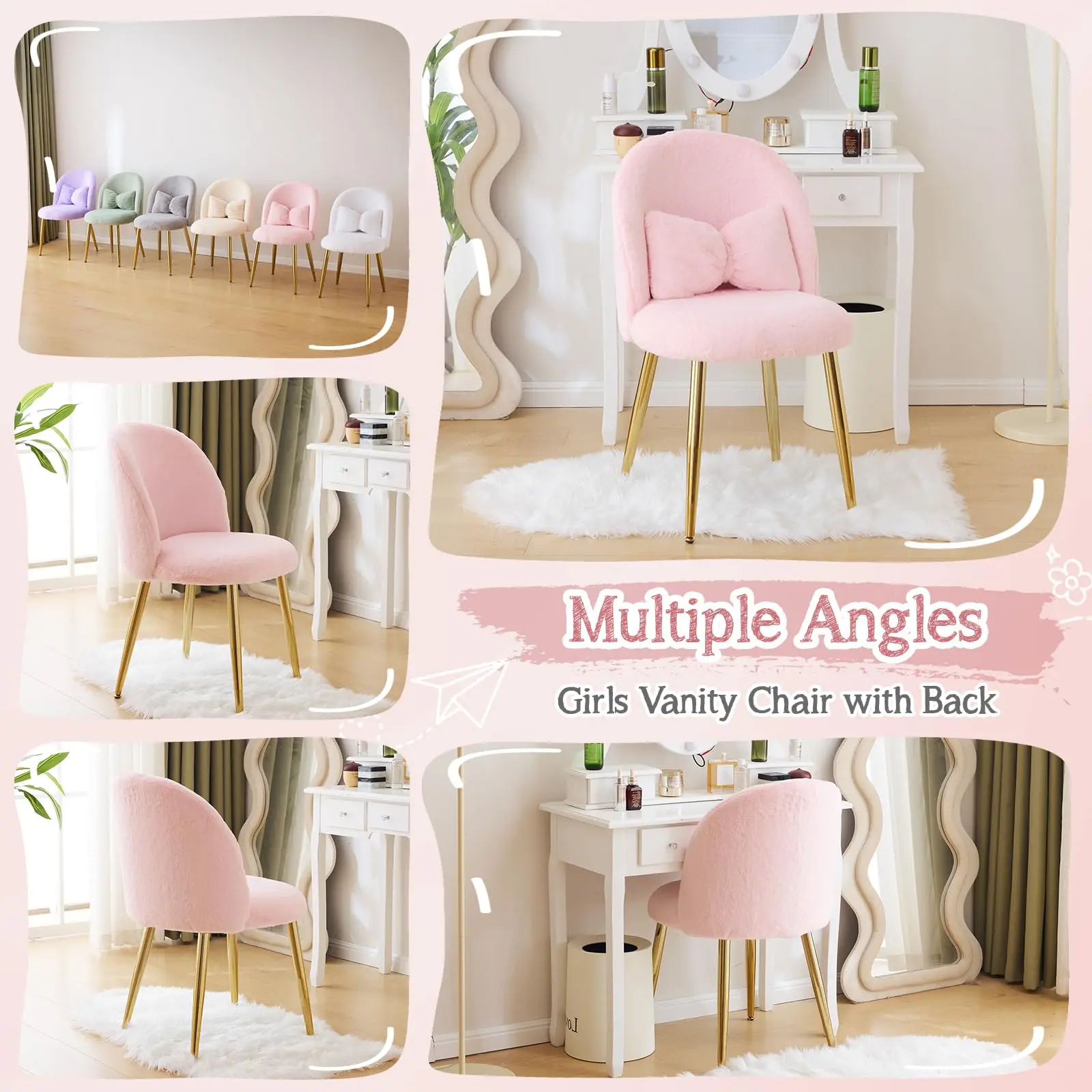 ·Simple setup with clear instructions. No special tools required. Make every day full of joy and comfort with this cute desk chair/makeup vanity chair.