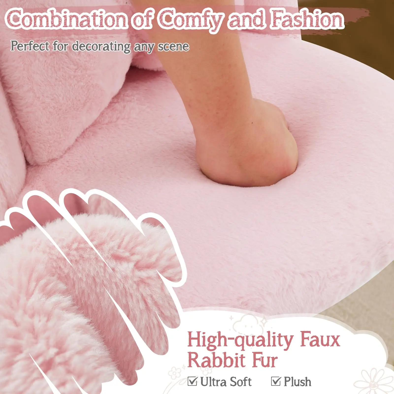 ·Plush faux rabbit fur/teddy fabric ensures a soft, cozy feel. High-density foam cushioning guarantees lasting comfort. The ergonomic backrest provides better support for makeup application or relaxation. This vanity chair offers a comfortable experience while adding warmth and loveliness to your space.
