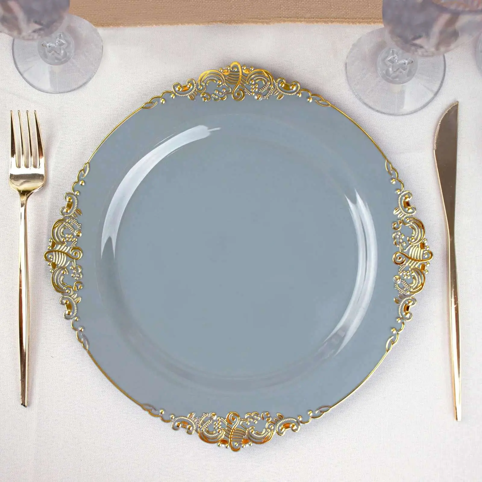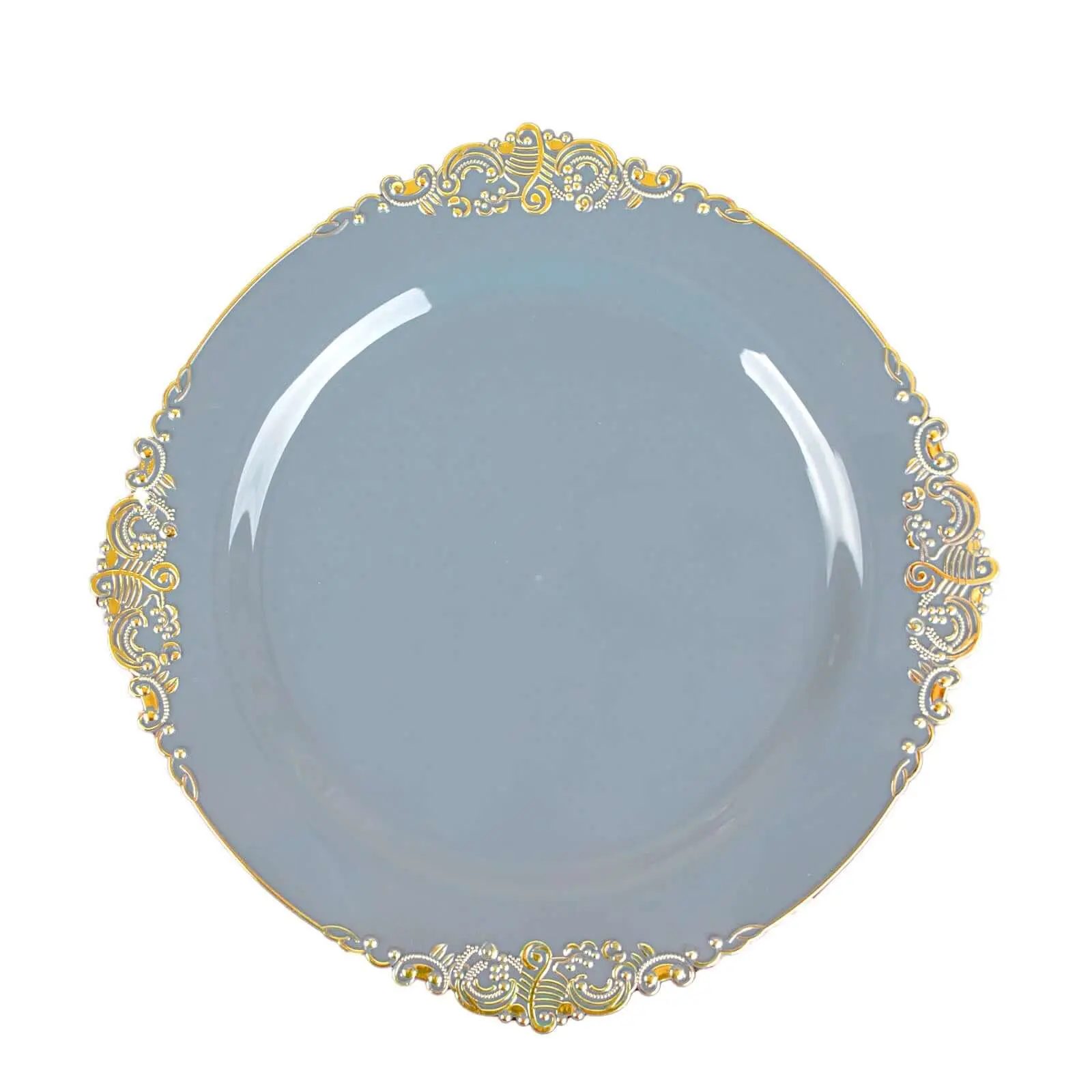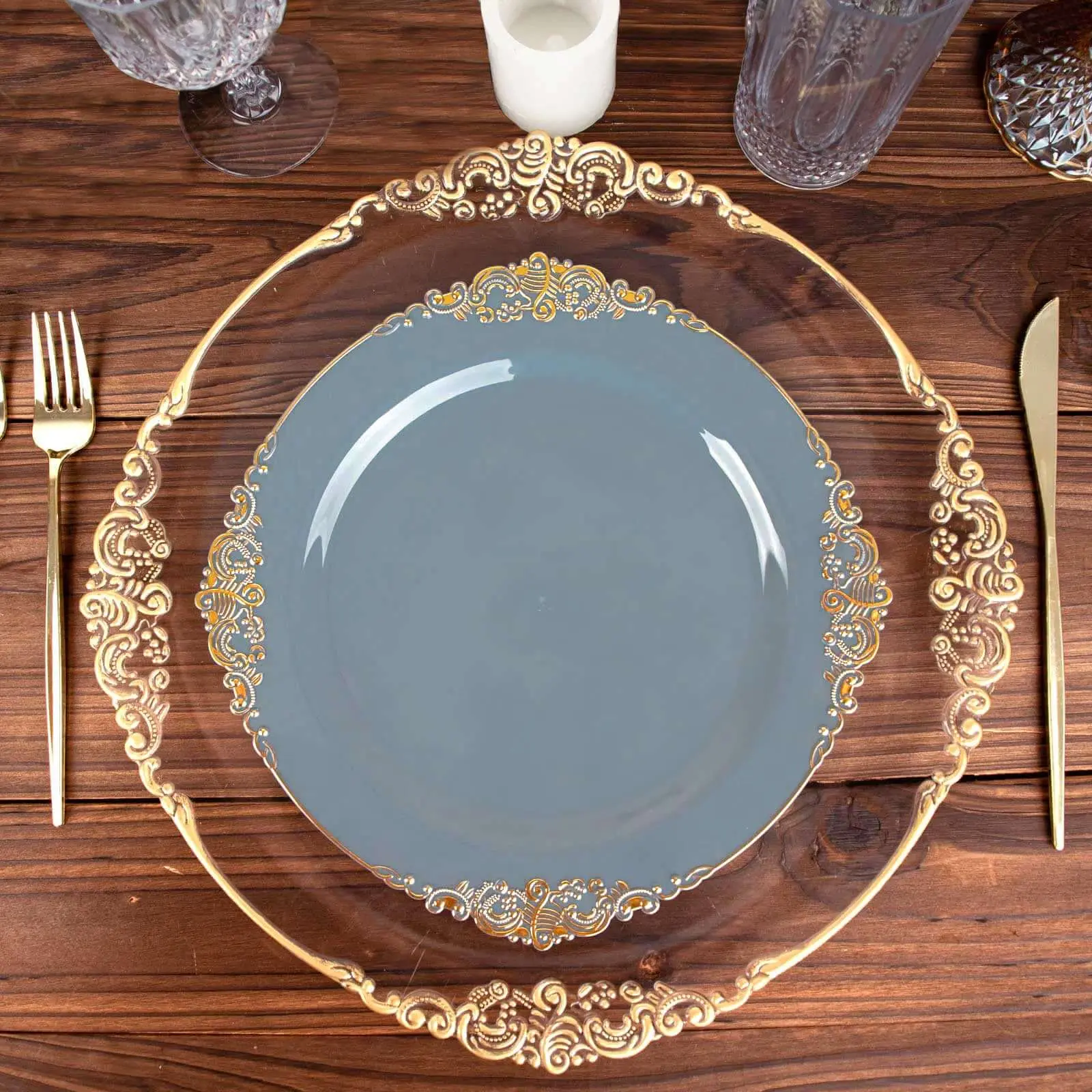 5. 10-Pack Plastic Round Dinner Plates 10" Dusty Blue with Gold Leaf Embossed Rim - Vintage Baroque Style Disposable Plates