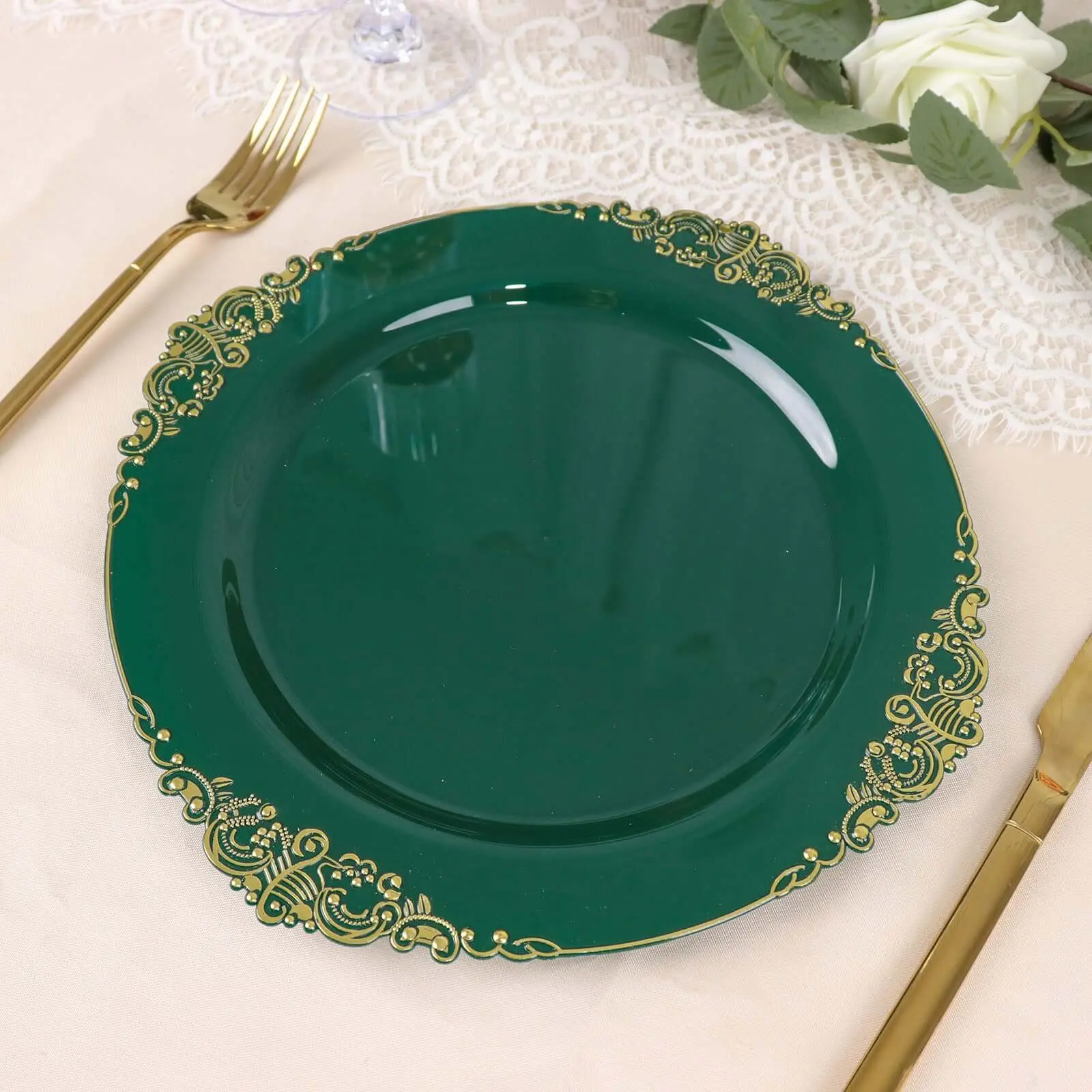 10-Pack Plastic Round Dinner Plates 10" Hunter Emerald Green with Gold Leaf Embossed Rim - Vintage Baroque Style Disposable Plates