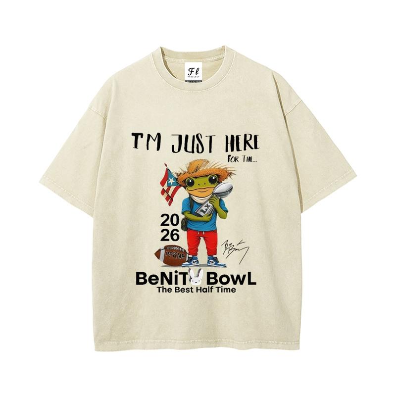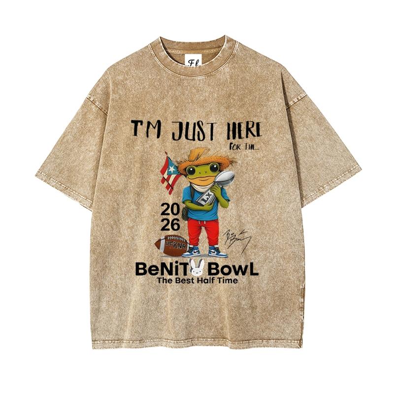·Design Highlights: This unisex shirt features a playful graphic of a character in a football uniform. The text "I'M JUST HERE FOR THE BENITO BOWL" adds a fun twist. 🎉