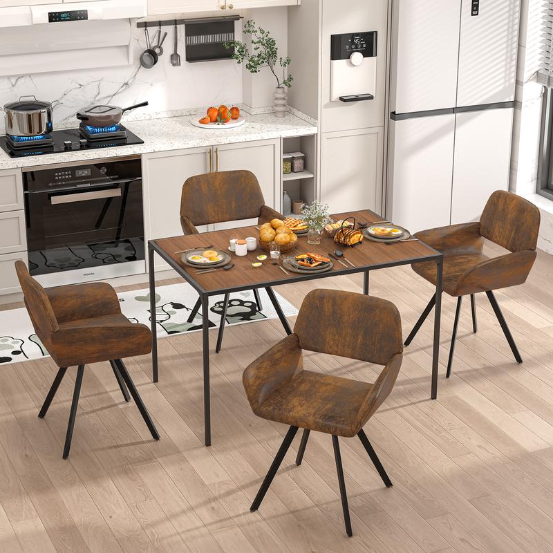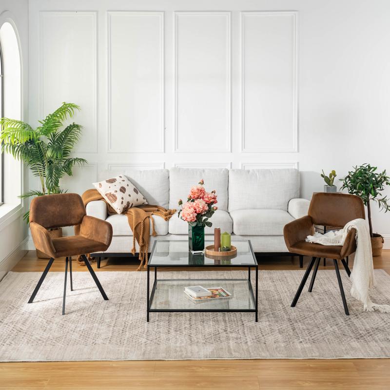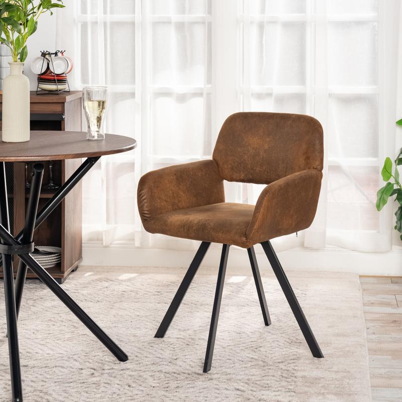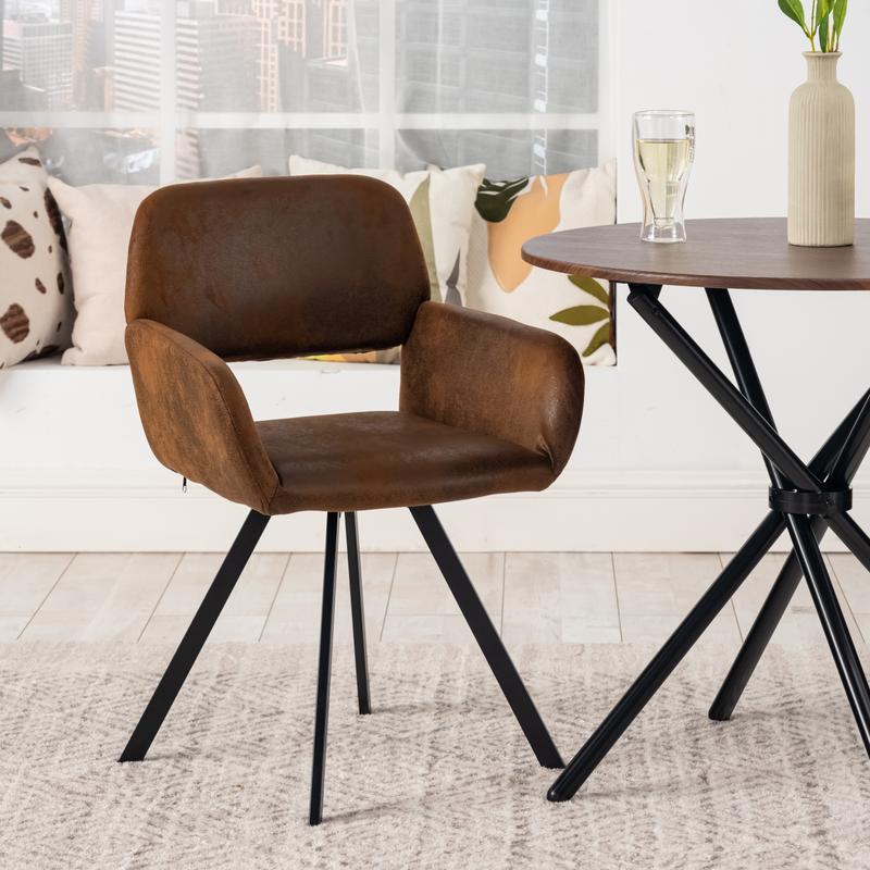Upgrade your dining area with this set of 2 vintage faux leather dining chairs. Featuring a retro brown finish, comfortable armrests, and sturdy black metal legs, these chairs offer both style and comfort. Ideal for kitchen, dining room, or as accent chairs in the living room. Easy to assemble and maintain.