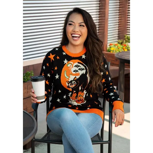 Well, this Vintage Halloween Cat Halloween Sweater may not give you the power to control cats. It will, however, give you a witch's familiar in the form of a cozy sweater to wear through the spooky season this year! The sweater is crafted out of a cotton and acrylic blend that's warm and comfortable, especially on those cool autumn days. It comes with a knit-in design of everything Halloween on the front, which includes a black cat, a mischievous moon in the background, and a pile of classic Jack o' Lanterns. It's perfect for cultivating a 'casual witch' look this year!