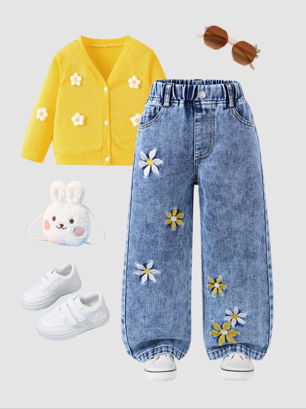 Vintage Light Blue Washed 3D Snowflake Jeans, Elegant Floral Embroidery Design, Perfect for Daily & Casual Wear, Fashionable Girls' Denim