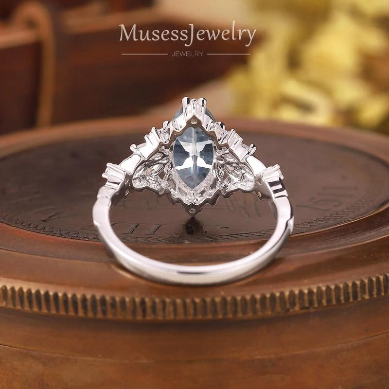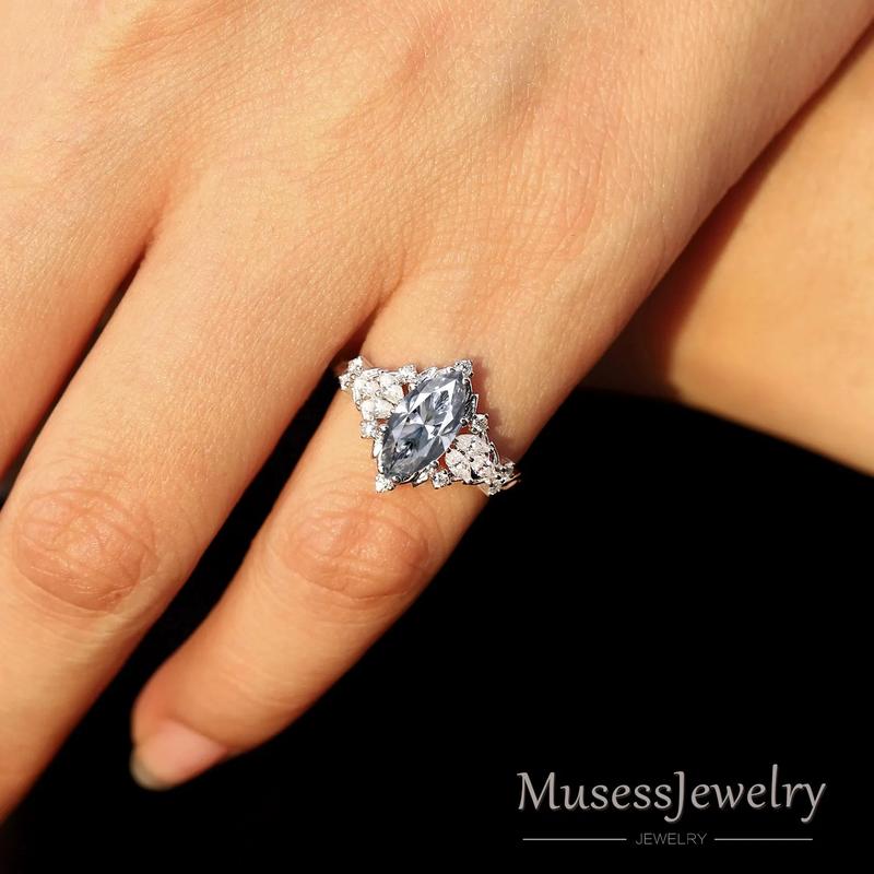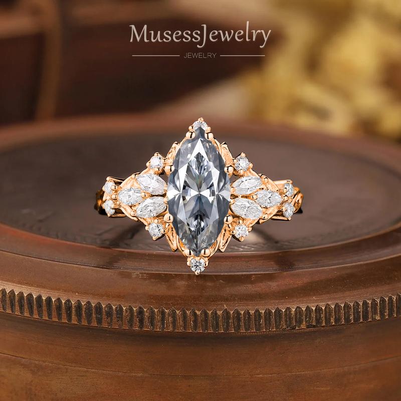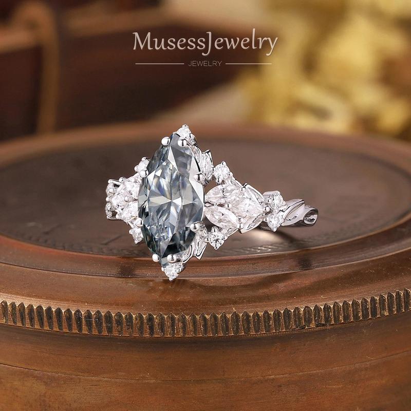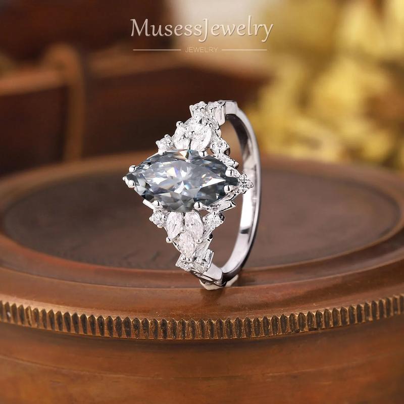 • Center stone: gray moissanite, marquise 5 × 10 mm, 1 ct
