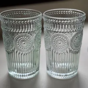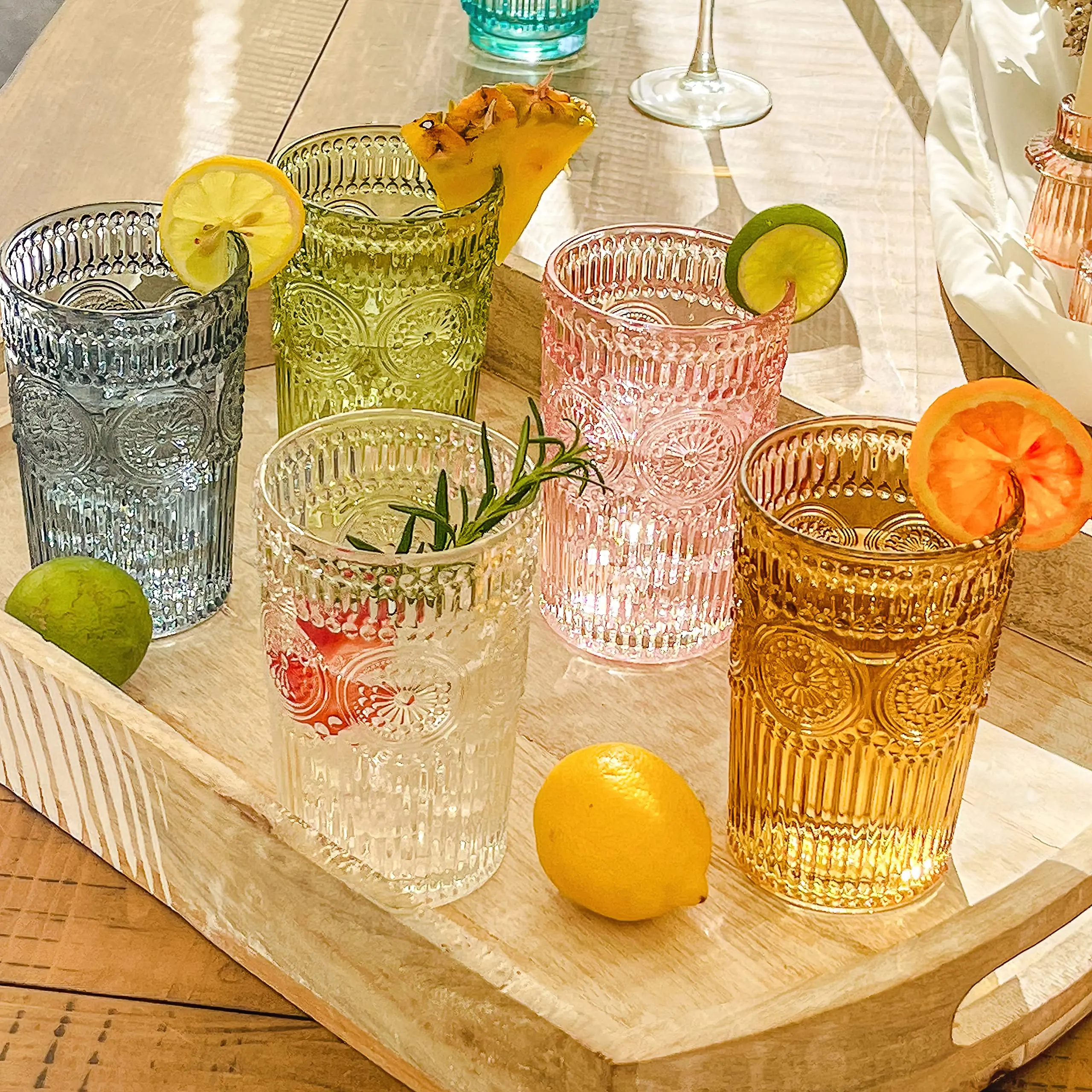 These 13 oz. Vintage Textured Sage Green Glasses (Set of 6) are just as pretty in person as they are on the screen. These ribbed glass cups will transport you to the past with each glass embossed with vertical lines around the base with a beautiful pattern of circles and polk-a-dots around the top making each glass look more like a piece of vintage art than just a drinking glass. These cocktail glasses have a great weight to them and are perfect for your favorite cold beverage. They are lead free making them a great every day drinking glass too. They are so beautiful that they add the perfect vintage touch to any themed party, whether they hold straws, pretzel rods, candy canes or are used as drinking glasses, they are sure to be the talk of the party.