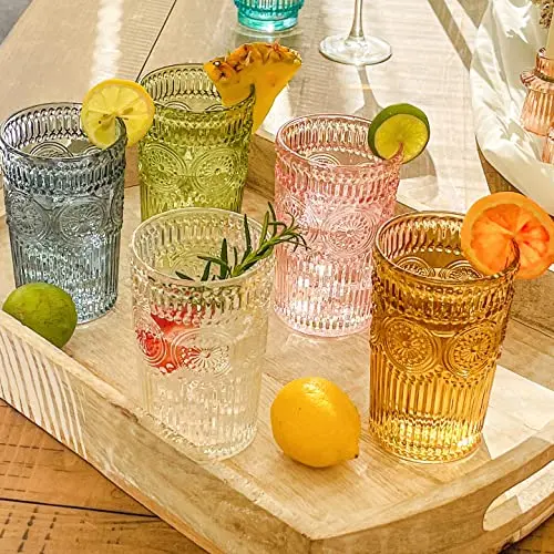Whether you are throwing a boho baby shower or a summer garden party these glasses will make the perfect impact to your table and wow your guests. Great for any gender neutral baby shower or for a bridal brunch and perfect for making a signature drink. They make great gifts for those hosts with the most or for a housewarming gift for your bestie. They are great to add color to your bar cart or just to drink your green juice or favorite iced coffee in the morning. We ship each glass safely bubble wrapped and shipped in a brown box to insure that every glass makes it safe to your home. With the look of depression glass or sea glass, if you are gifting these to a friend, be sure to get a set for yourself! Available in 4 different colors: blue, clear, green and pink; pick up a set in each of the different colors to create a mix and match masterpiece!