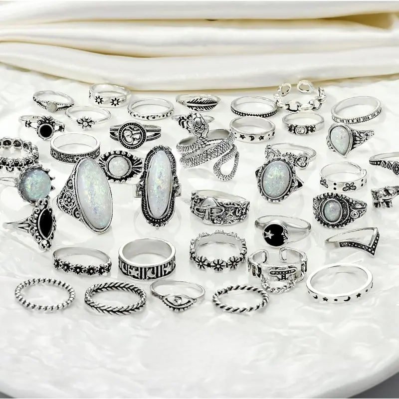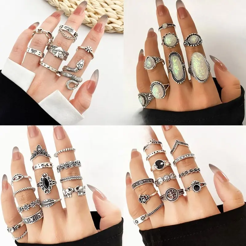 Each ring showcases unique designs like snakes, skulls, evil eyes, butterflies, elephants, mushrooms, stars, hearts, flowers, and celestial patterns. With varied sizes, they can be worn as knuckle or midi rings. Customize your look with multiple styles. ✨