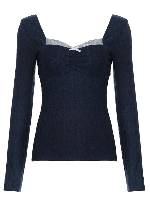 Vintage Square Neck Slim Fit Lace Patchwork Knit Long Sleeve Top, Sweet Ruched Bow Cute Spring Shirt, College Style Y2K Aesthetic Tee