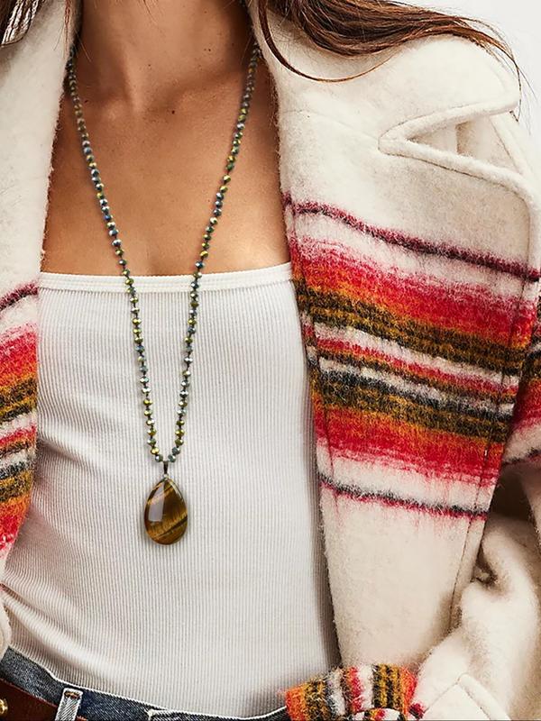 5. Vintage Tiger Eye Teardrop Natural Stone Pendant Long Necklace, Handmade Knotted Crystal Beaded Chain, Sparkling Luxury Gift for Special Occasions, Boho Chic Crystal