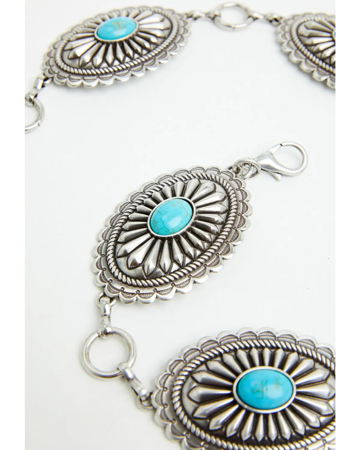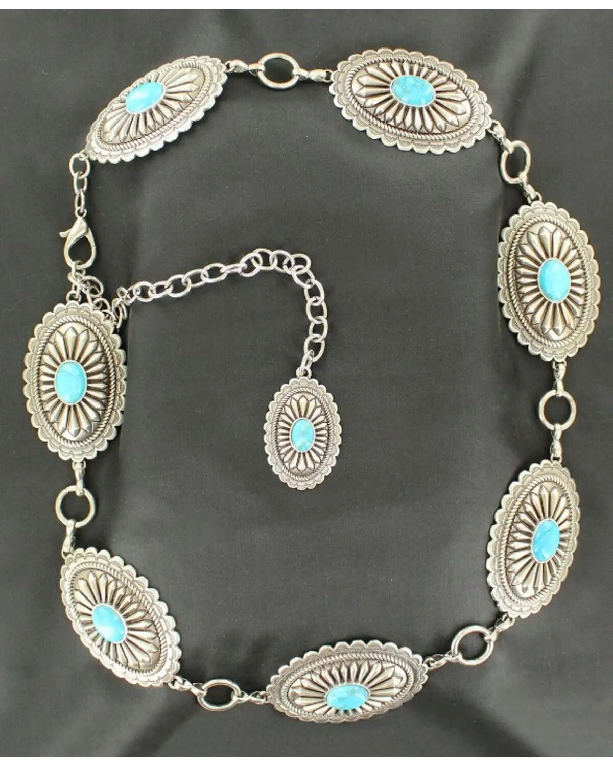 Add a bold statement to your outfit with this Western Concho Chain Belt, featuring ornate oval medallions and turquoise stone accents.