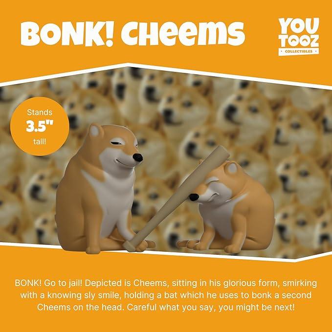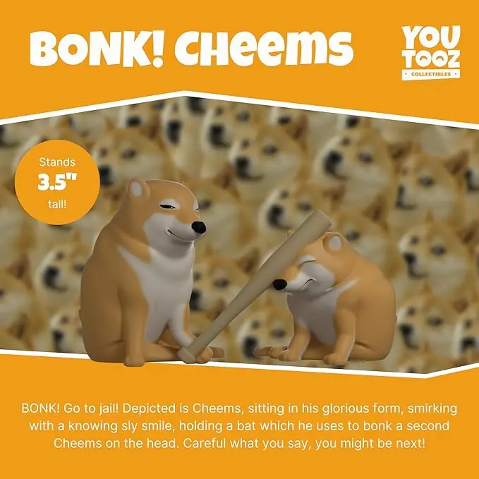 BONK! Go to jail! A new addition for your Youtooz Cheems Collection, we bring you Bonk! Cheems. Depicted is Cheems, sitting in his glorious form, smirking with a knowing sly smile, holding a bat which he uses to bonk a second Cheems on the head. Be careful what you say, you might be next! The interior of his box is designed to show Cheems in his natural habitat, cozy in his living room. The exterior illustrates Shiba Inus happily playing, Bonk!, and Cheems’ smirking against a pattern of white doge paws. This collectible ships in a matte, embossed, protective outer sleeve inside a shipping carton sealed with Youtooz tape. *Bonk* *Bonk* *Bonk* *Bonk* *Bonk* *Bonk*