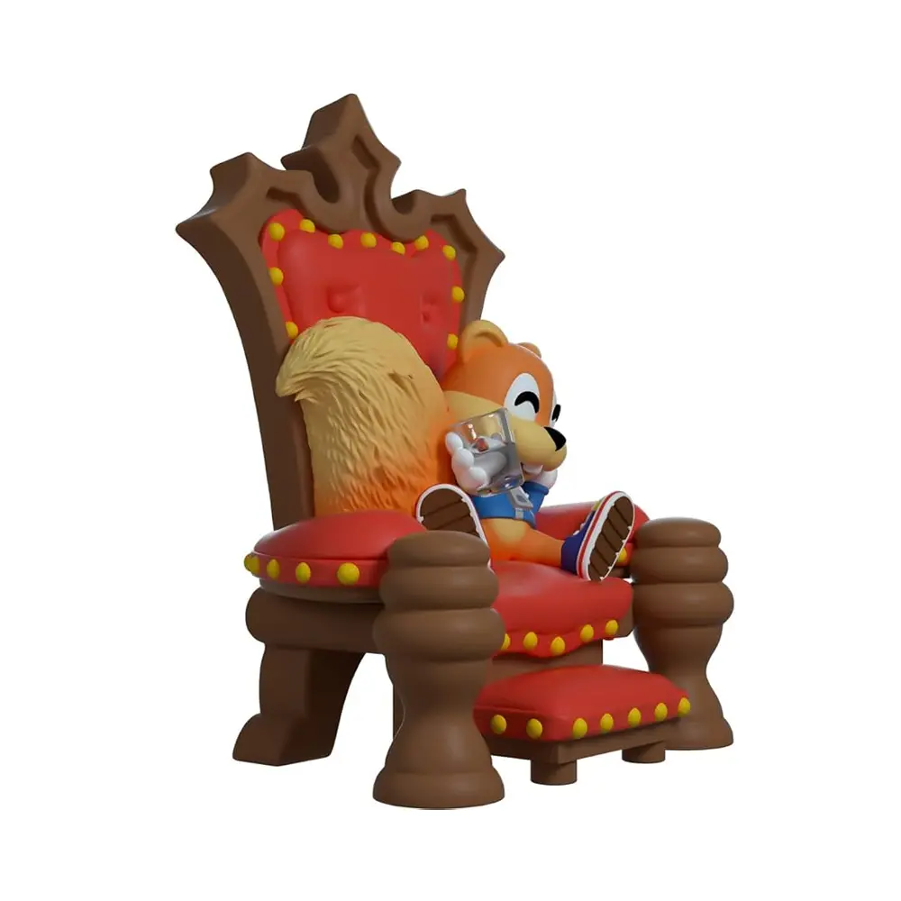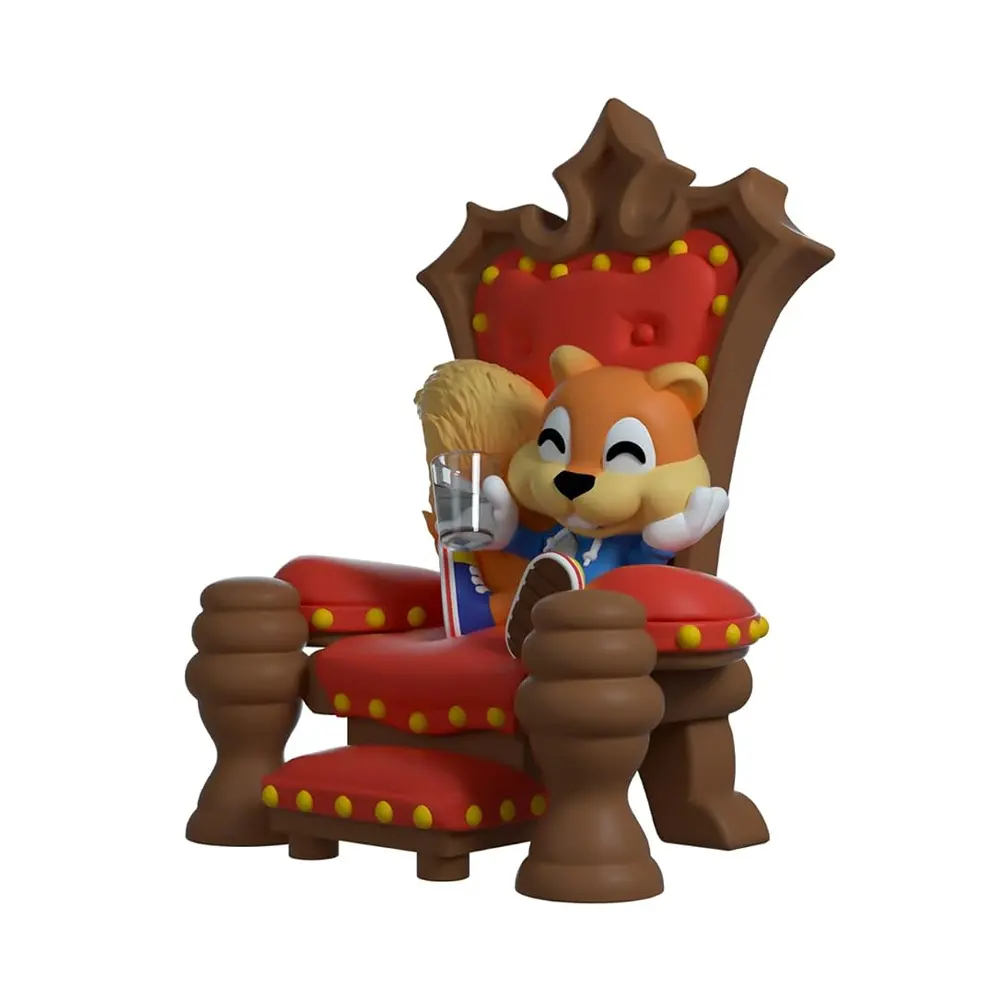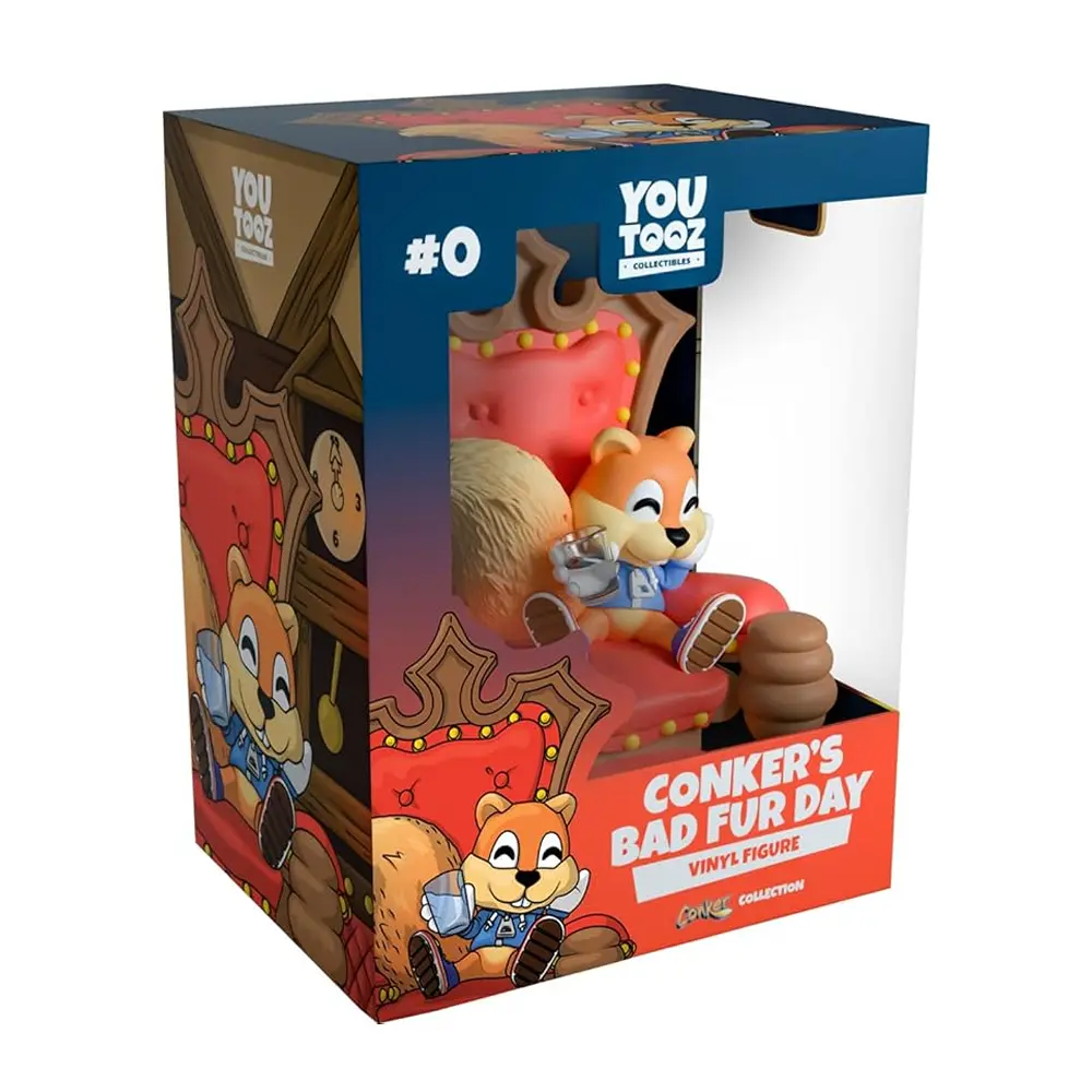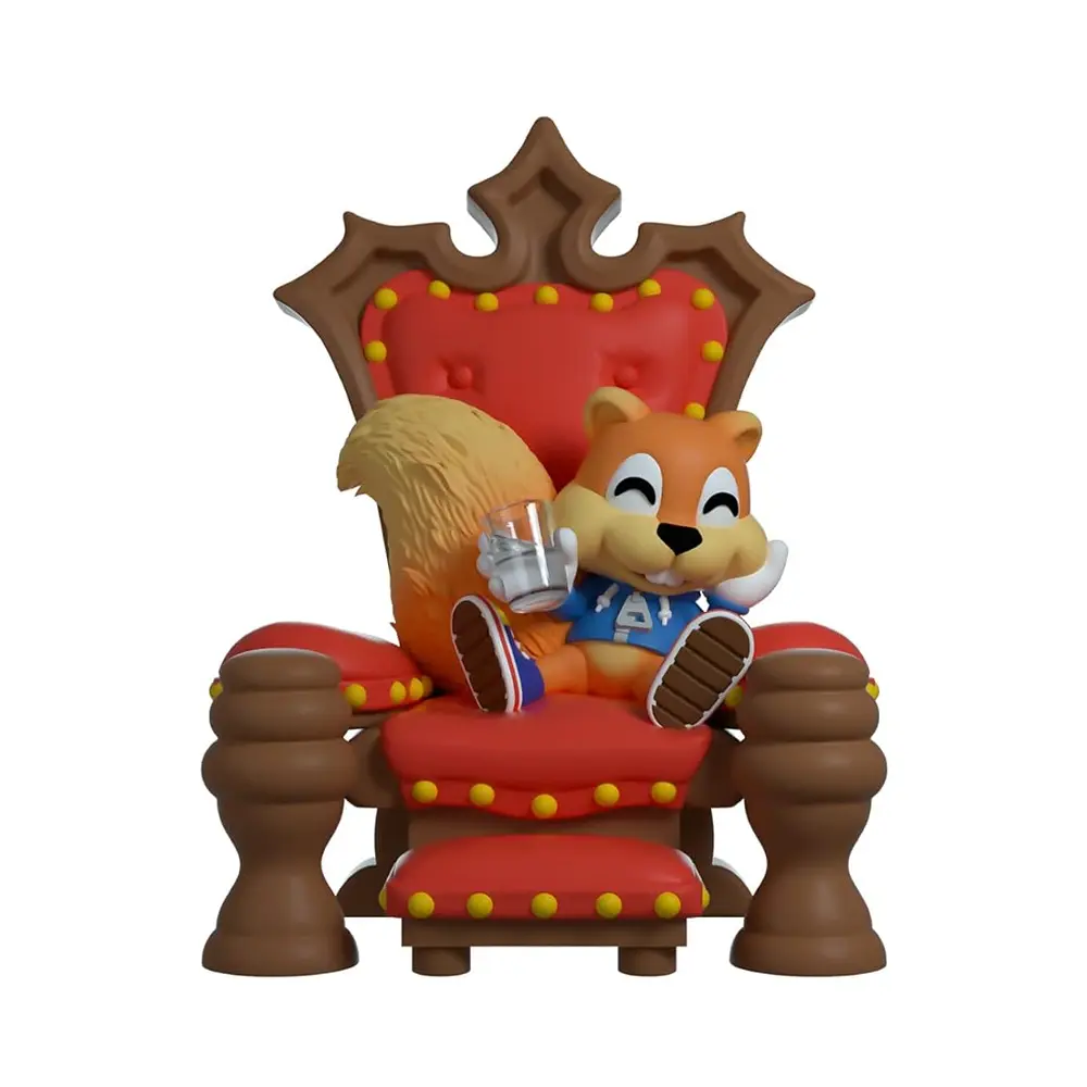 I may be king and have all the money in the world, and all the land, and all that stuff. But you know, I don't really think I want it. I just wanna go home, with Berri, and, I don't know... have a bottle of beer. Conker’s figure sits at 4.8 inches tall, set on a luxurious red and oak brown throne. Conker sits in his blue lace up sneakers and a blue hoodie, holding a half-full glass. His bushy tail puffs out behind him and he grins, showing off his two front teeth. The interior and exterior of his double-walled window box has him sitting in front of the fire, prepared to tell his story. And what a tail it is. Oh, what a world, what a world! This collectible ships in a matte, embossed, protective outer sleeve and a custom sized plastic protector for maximum protection during shipping.