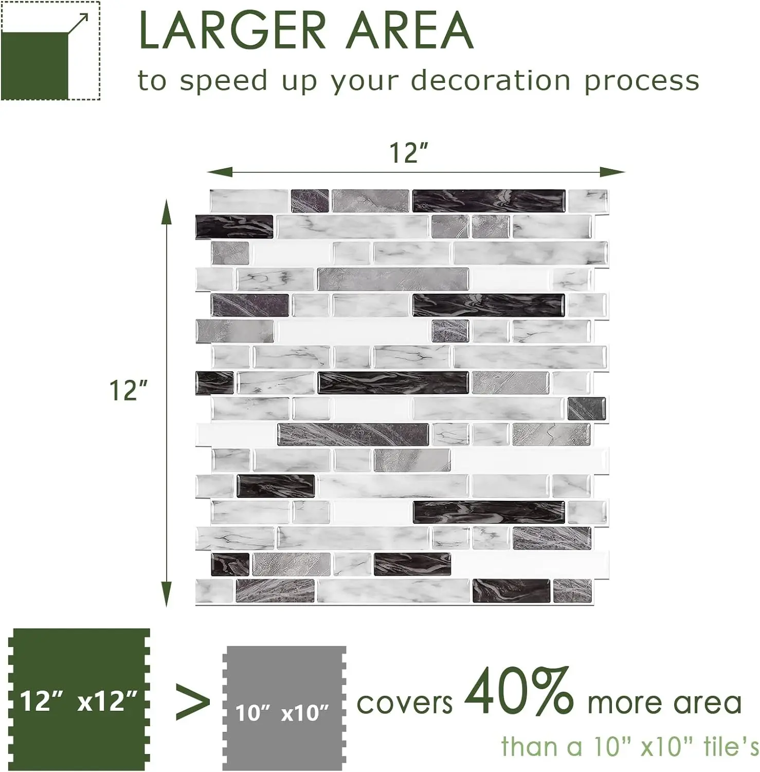 ✿1.4 Times Coverage Area: 10 sheets thickened self-adhesive tiles, 12" X 12" each, which covers 40% more area than 10"x10" tile