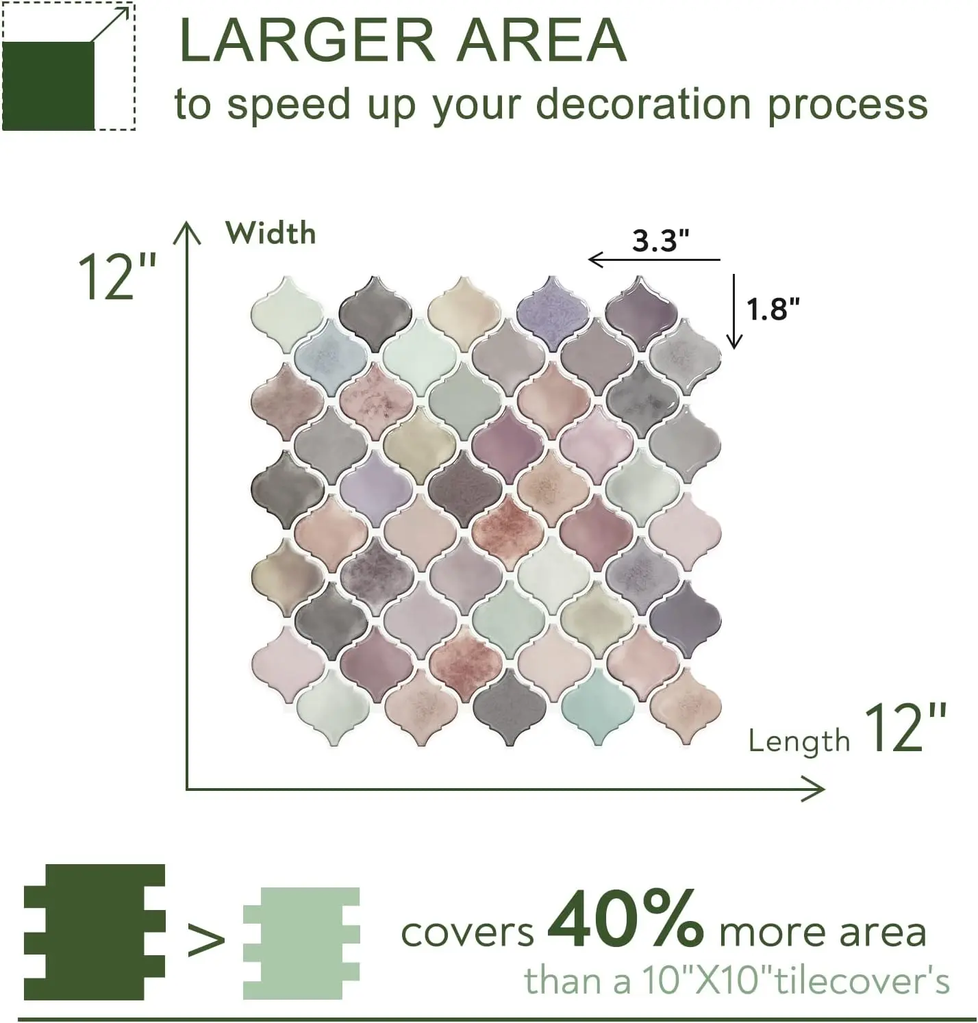 ✿1.4 Times Coverage Area: 10 sheets thickened self-adhesive tiles, 12" X 12" each (The diameter of the small piece is 1.85 inches), which covers 40% more area than 10"x10" tile