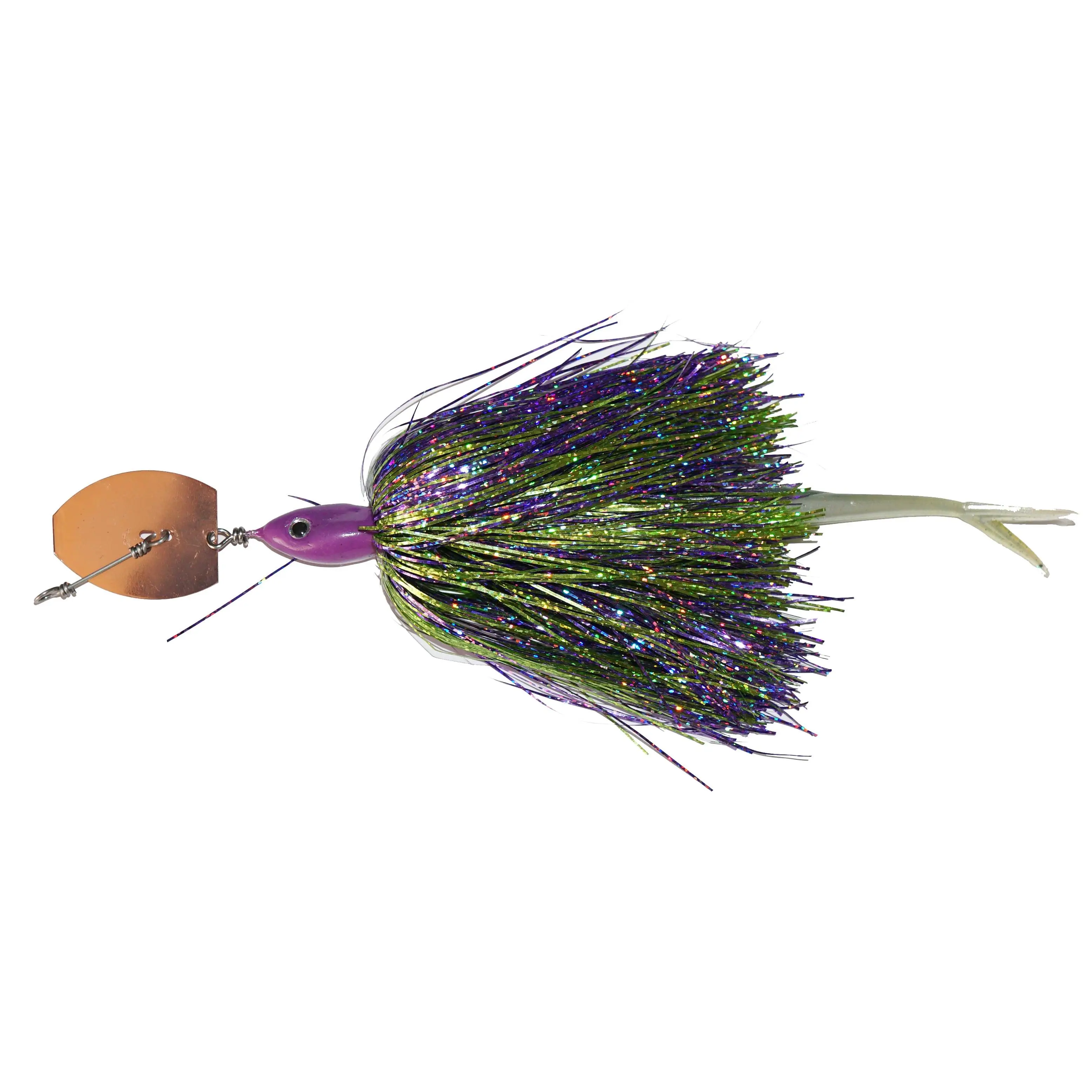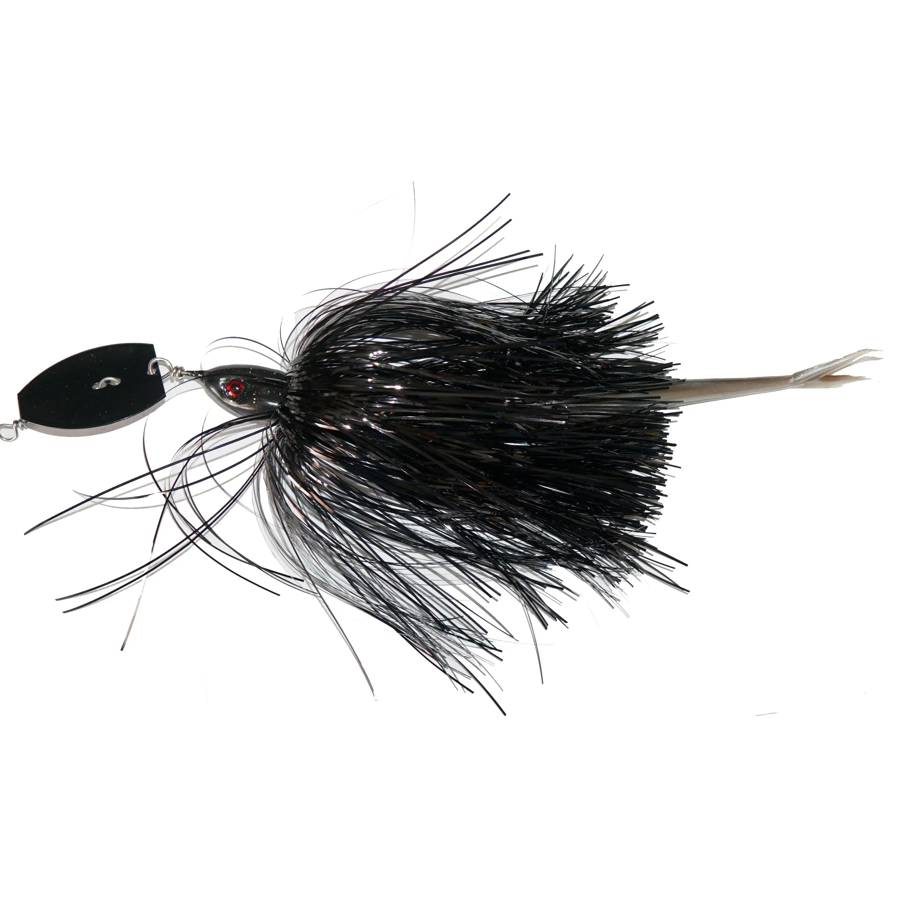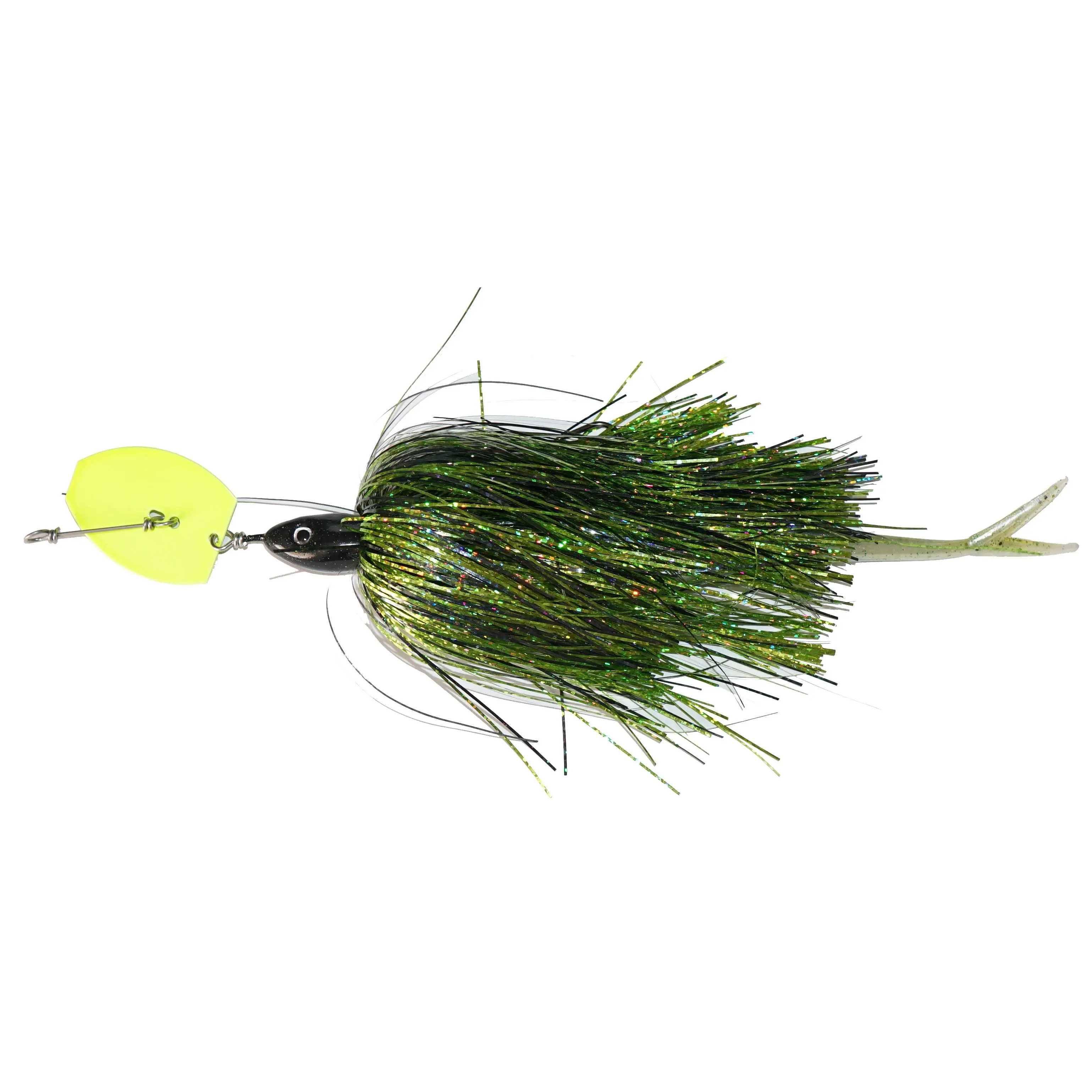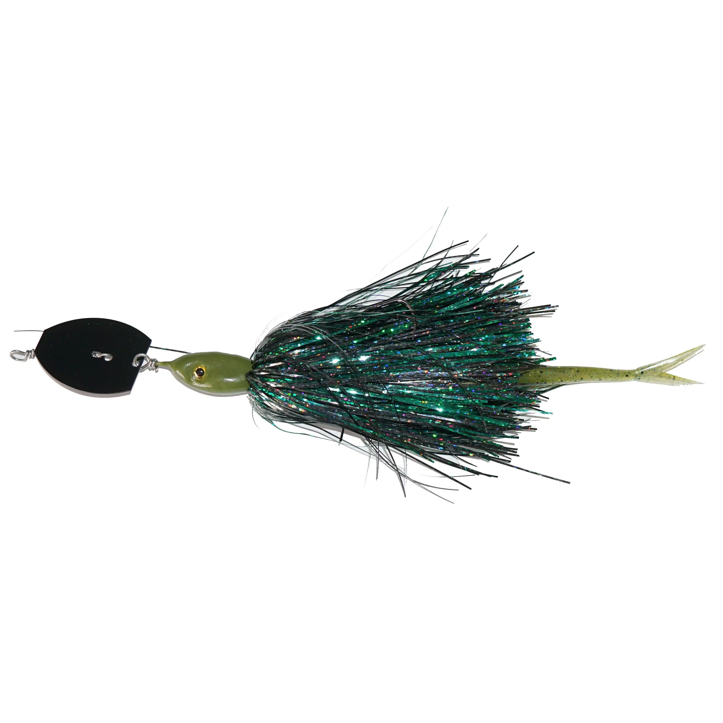 Chatter bait performance with very weedless qualities. One single hook, flashabou skirt and a soft tail.