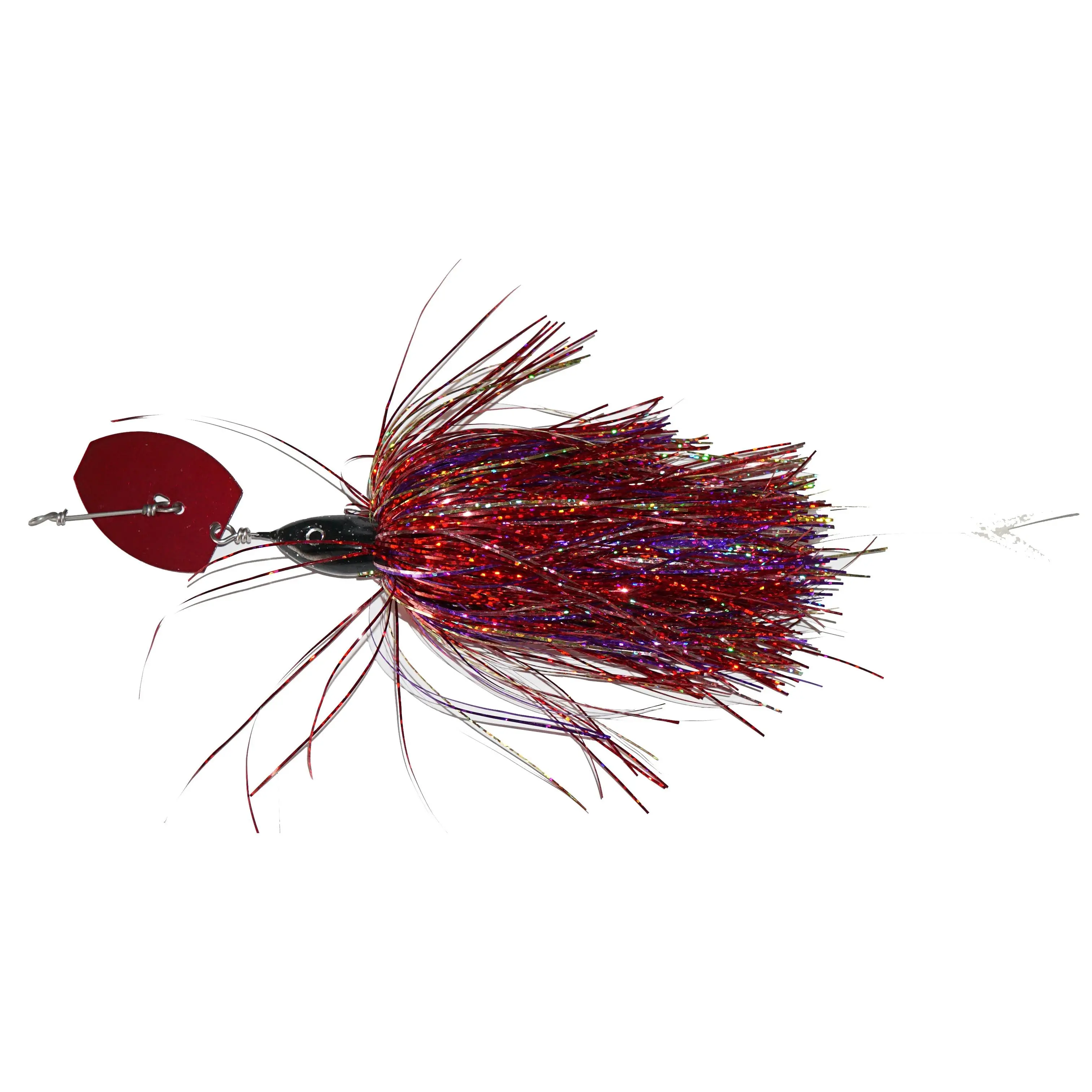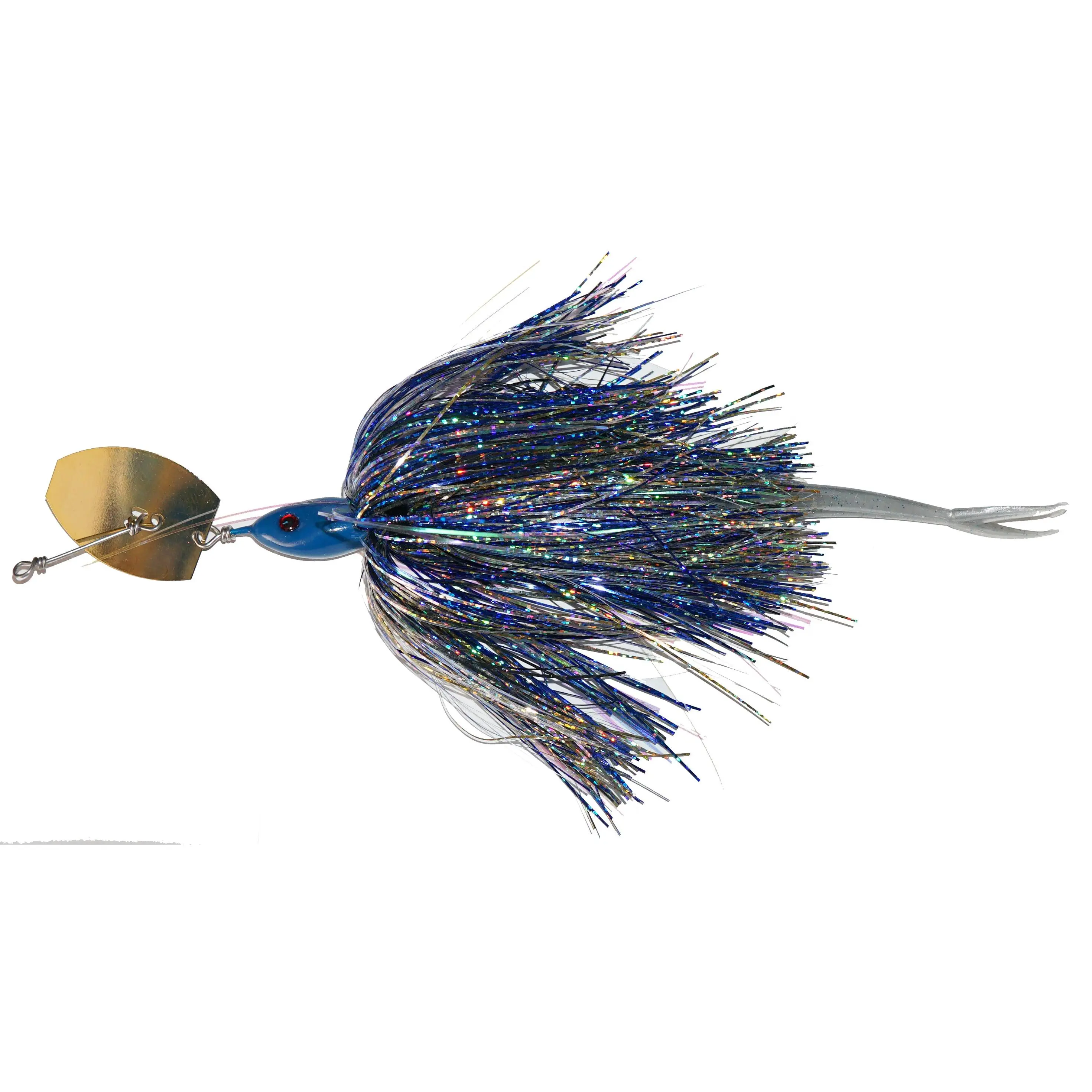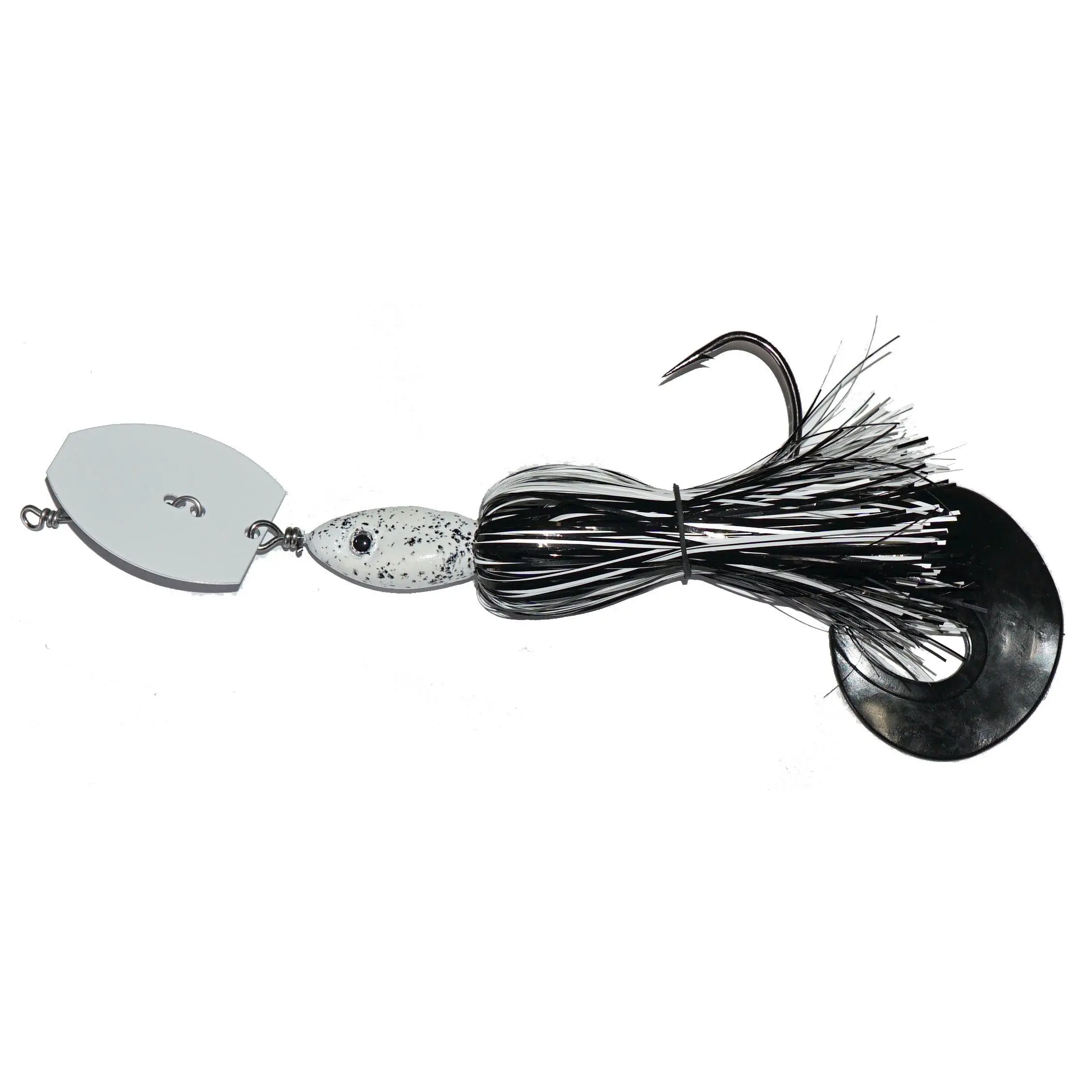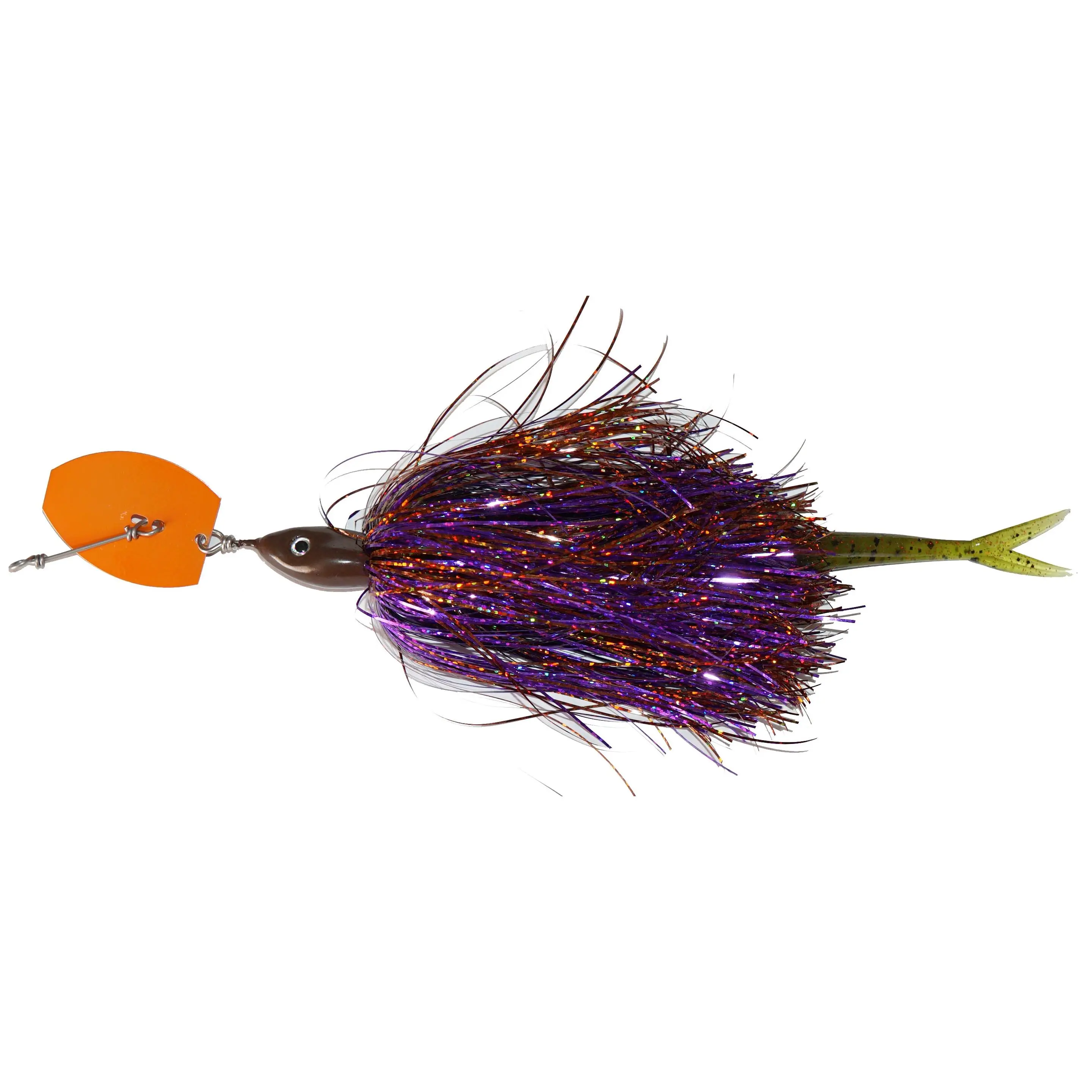 Chatter bait performance with very weedless qualities. One single hook, flashabou skirt and a soft tail.