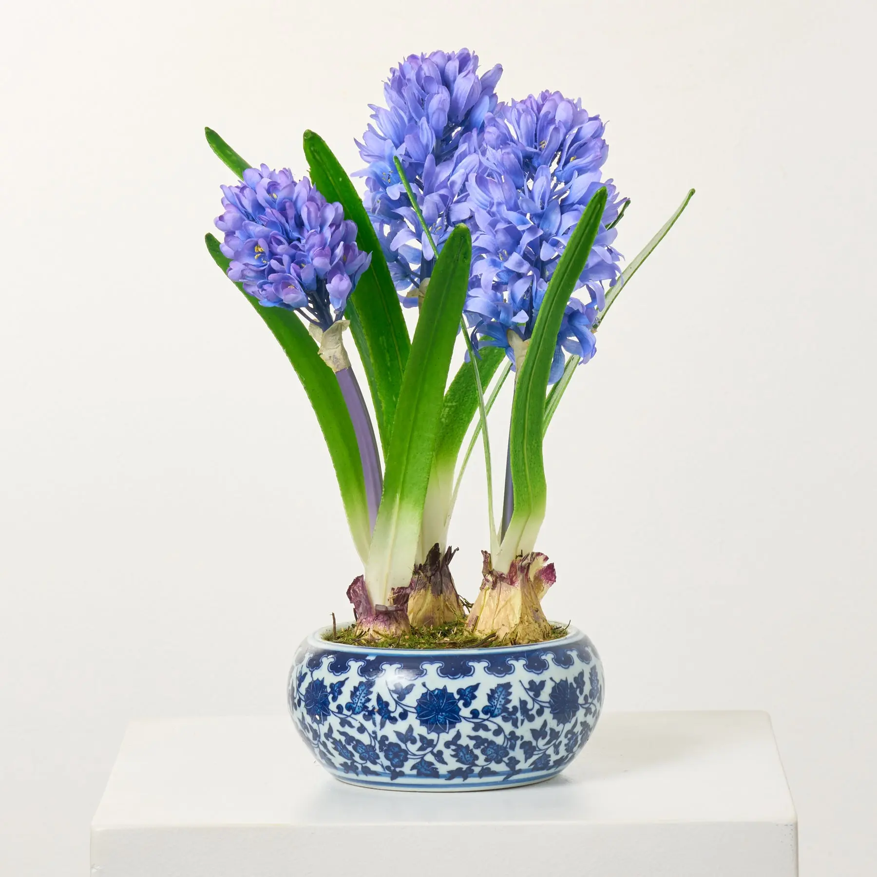 5. Violet Blue Hyacinth Bulbs Artificial Indoor Houseplant in Blue & White Chinoiserie Piot