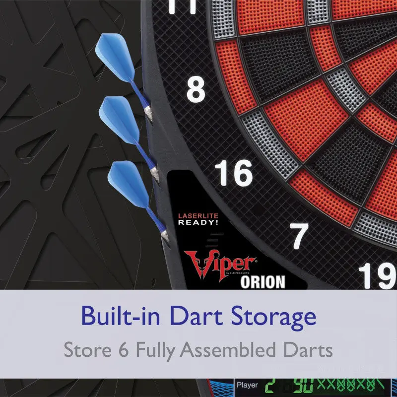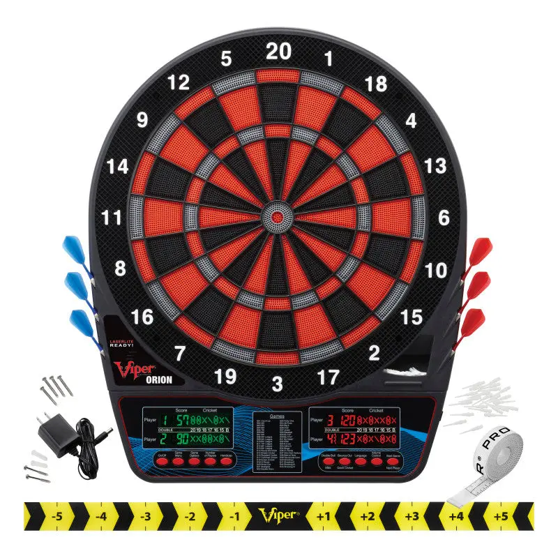 Shoot for the stars with the Viper Orion Electronic Dartboard. This electronic dart board features a regulation-sized 15.5” target area with target tested tough segments to withstand your toughest throws again and again. The Viper Orion has 43 dart games, including 01 and cricket, and over 300 scoring options so you can play how you want to. There is even a Cricket quickplay button so you’re always just a couple button presses away from playing. The Viper Orion dart board has an ultra-thin spider to maximize the scoring area, and the dual LCD display automatically scores all of your games so you’ll never have to worry about inaccurate scorekeeping. With up to 8 player multiplayer, everyone can join in on the fun. This electronic dartboard comes with six starter soft tip darts, replacement dart tips, and is powered by the included AC adapter.