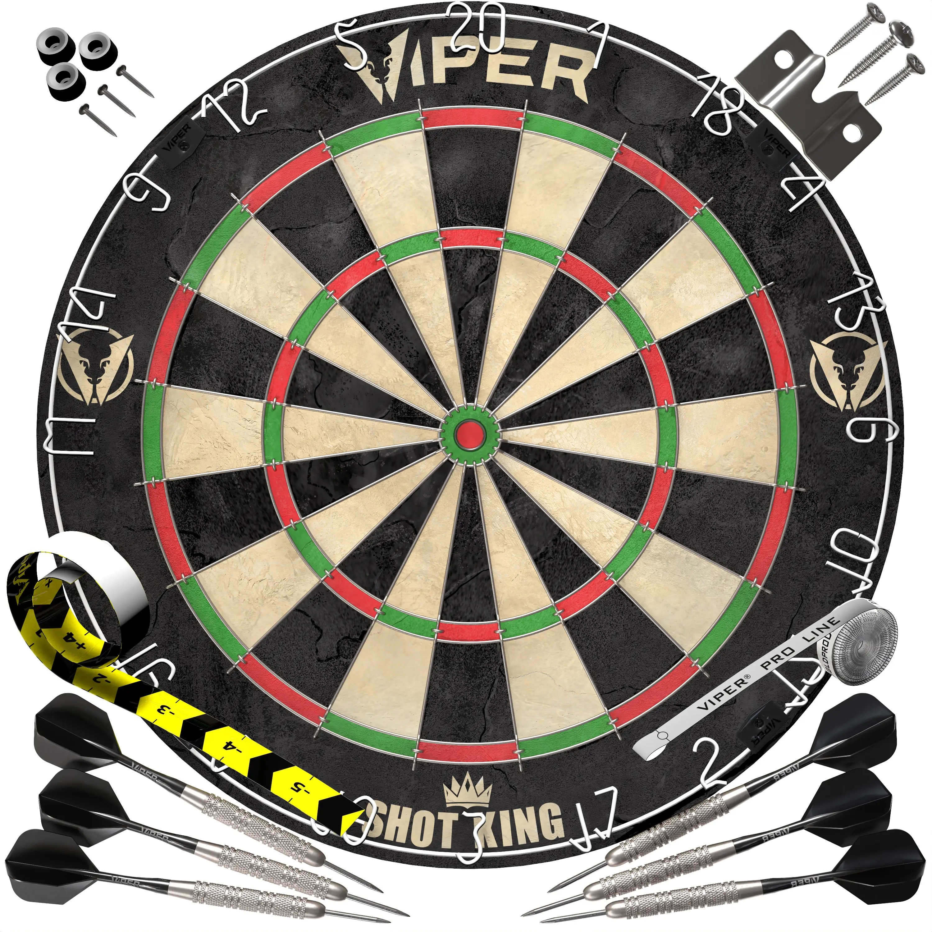 Become a darting ace with the Viper Shot King Sisal Dartboard. This 17.75” professional-quality steel tip dart board is made with self-healing sisal fibers to ensure a long life. The scoring segments are separated by a circular steel spider-wire and the inner bullseye is staple-free to help you hit your target, reducing bounce-outs and deflections. The Shot King steel tip dartboard also features a movable number ring, just detach and rotate your board to reduce wear on the most used sections, significantly extending its life and saving you money! To complete the package we’ve included easy-to-use mounting hardware and two sets of starter steel tip darts so you can play right out of the box.