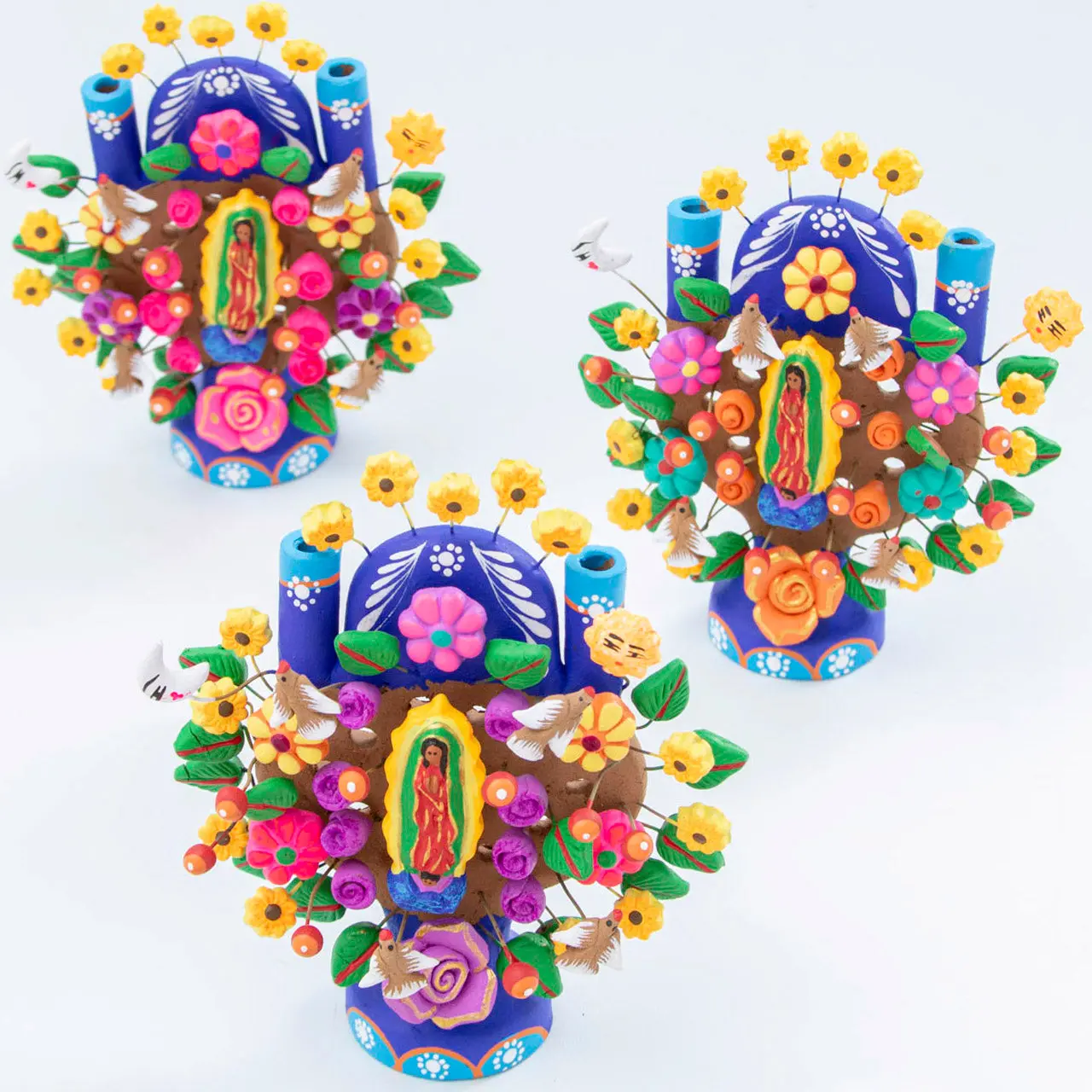 Get a piece of one of Mexico's most representative traditions of art! Don't let its small size discourage you from appreciating all the small, individually crafted clay pieces centered around Mexico's patron, La Virgen de Guadalupe, to make her stand out. A colorful statement piece that can be placed anywhere to show your love for Mexican Folk Art and culture!