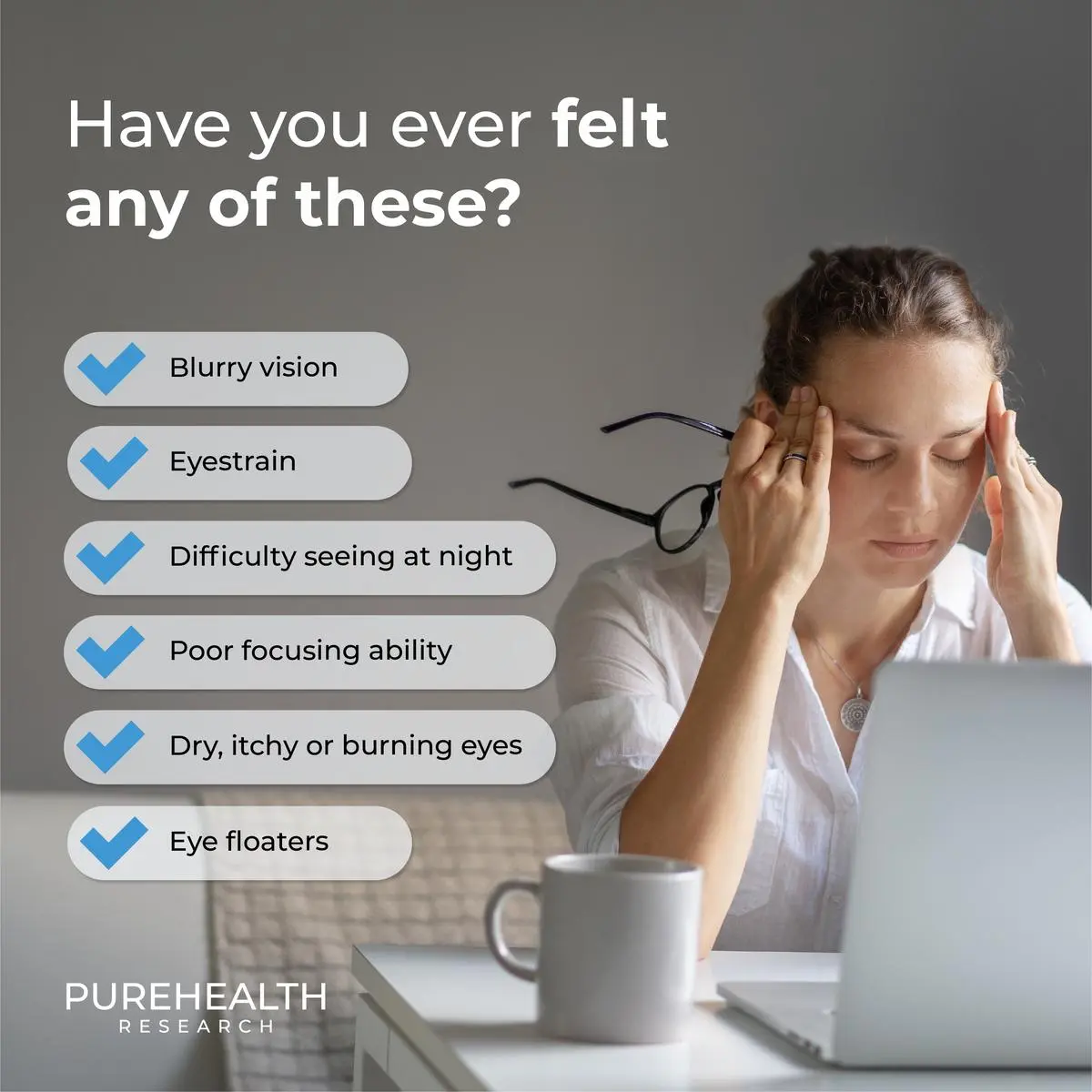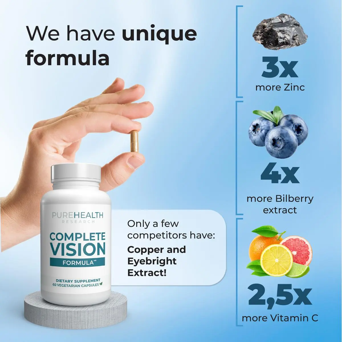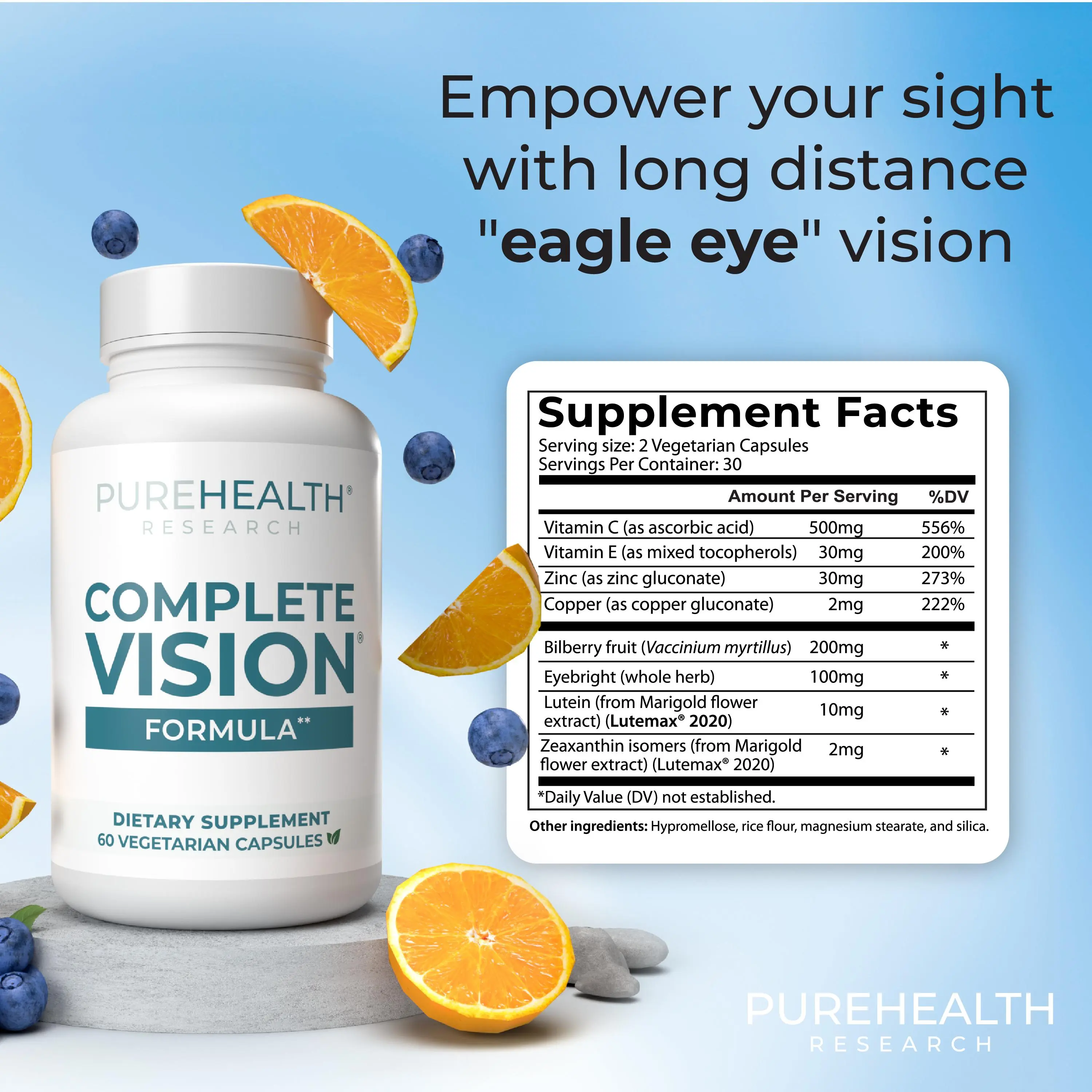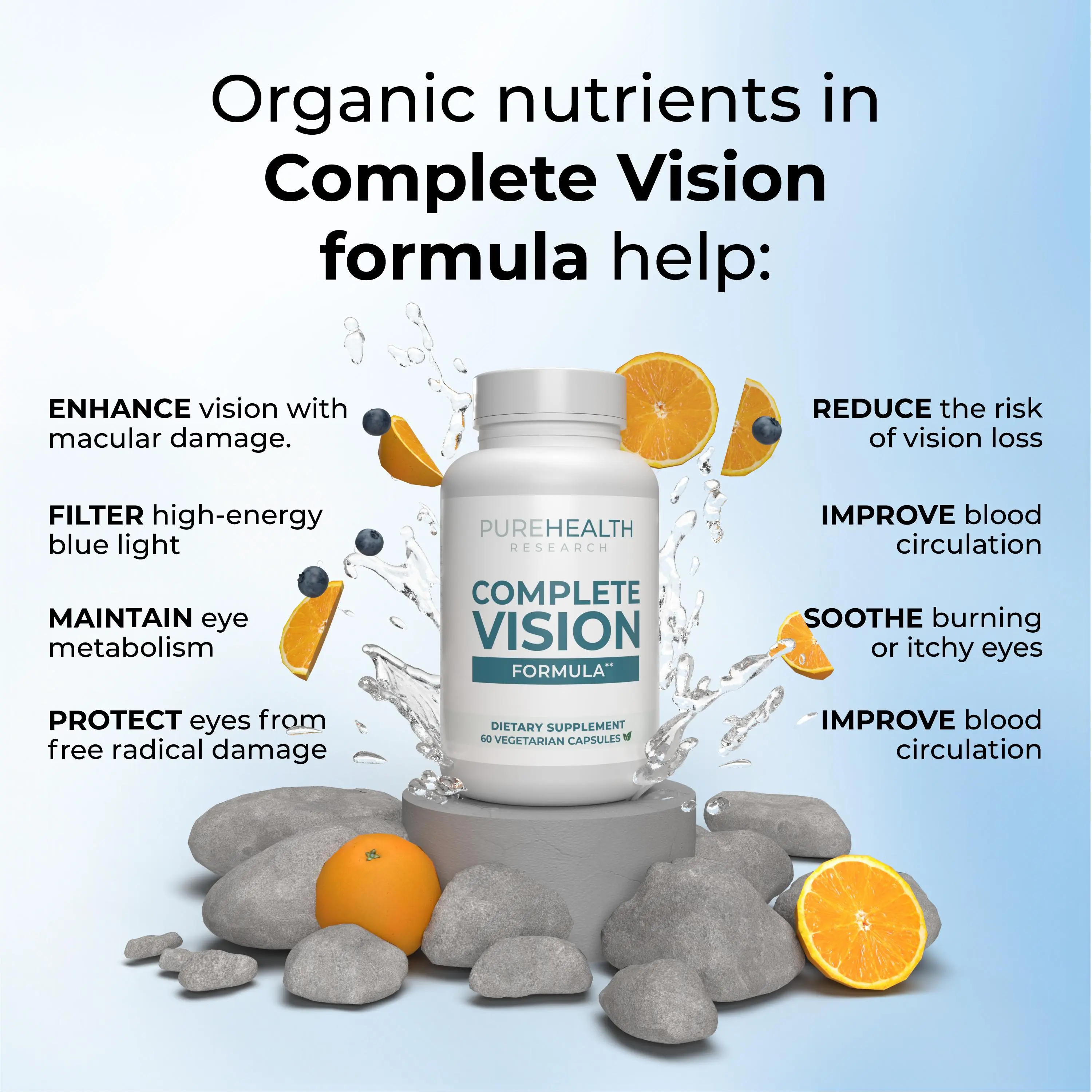 Are you experiencing eye strain, blurry vision, or discomfort from long hours on screens? Complete Vision Formula by PureHealth Research is here to help! Designed to nourish and protect your eyes, this premium supplement offers comprehensive support for clearer, healthier vision. Whether you're concerned about the effects of aging or environmental stress, this formula is the perfect solution to keep your eyes feeling refreshed and vibrant.